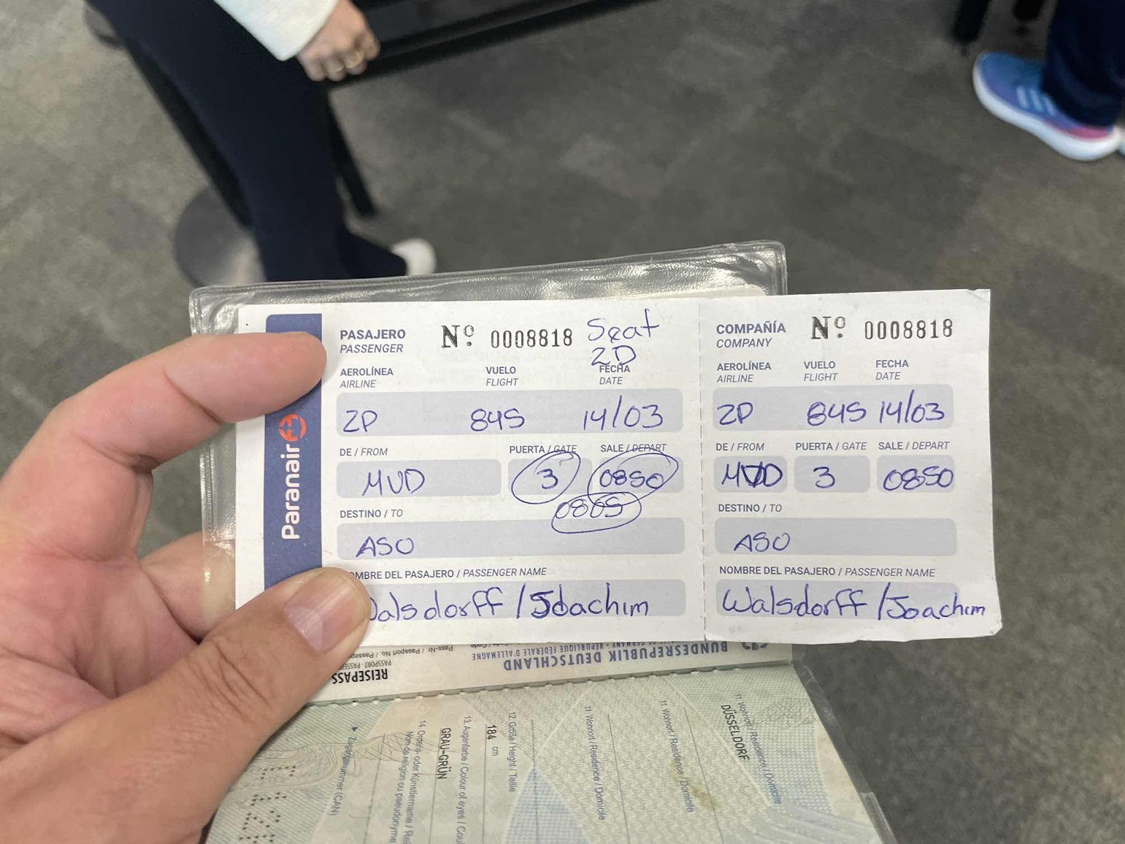 Und da ich das Ticket bei Latam gebucht hatte und nicht bei Paranair könnten sie nichts machen. Ich könne nicht mitfliegen und sollte das mit Latam klären.