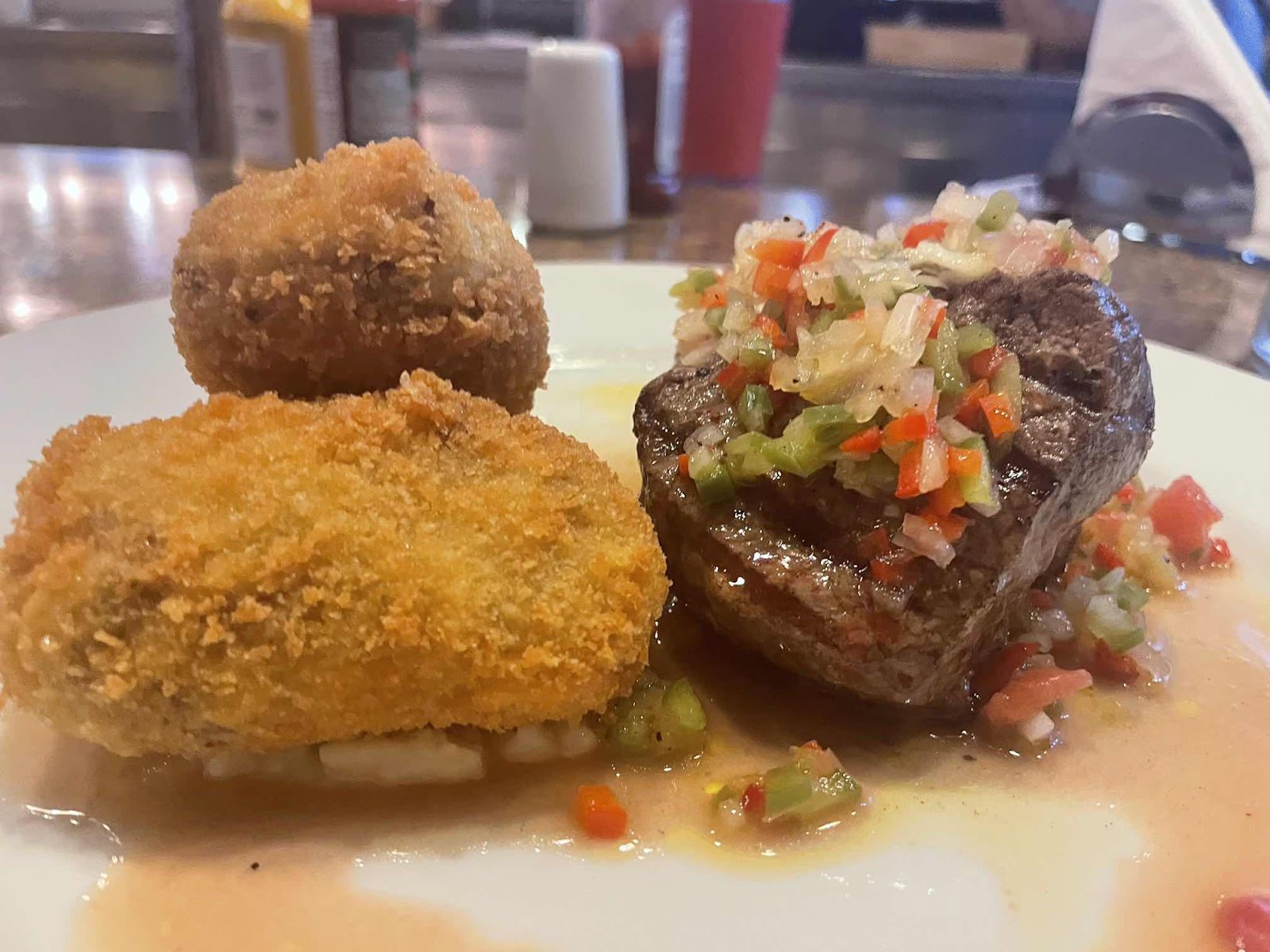 Aber gerechtfertigt, die Atmosphäre ist nett es ist zwar sehr sehr laut, aber das Essen ist toll. Zwei kleine Steaks, zwei Kroketten und etwas sehr klein gehäckseltes, fast rohes Gemüse in einer sehr leichten Sauce. Grandios!