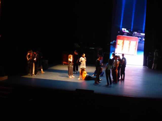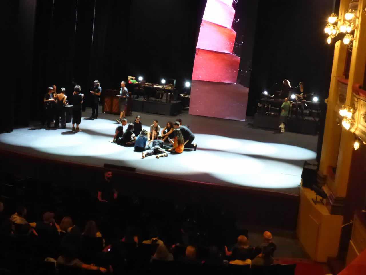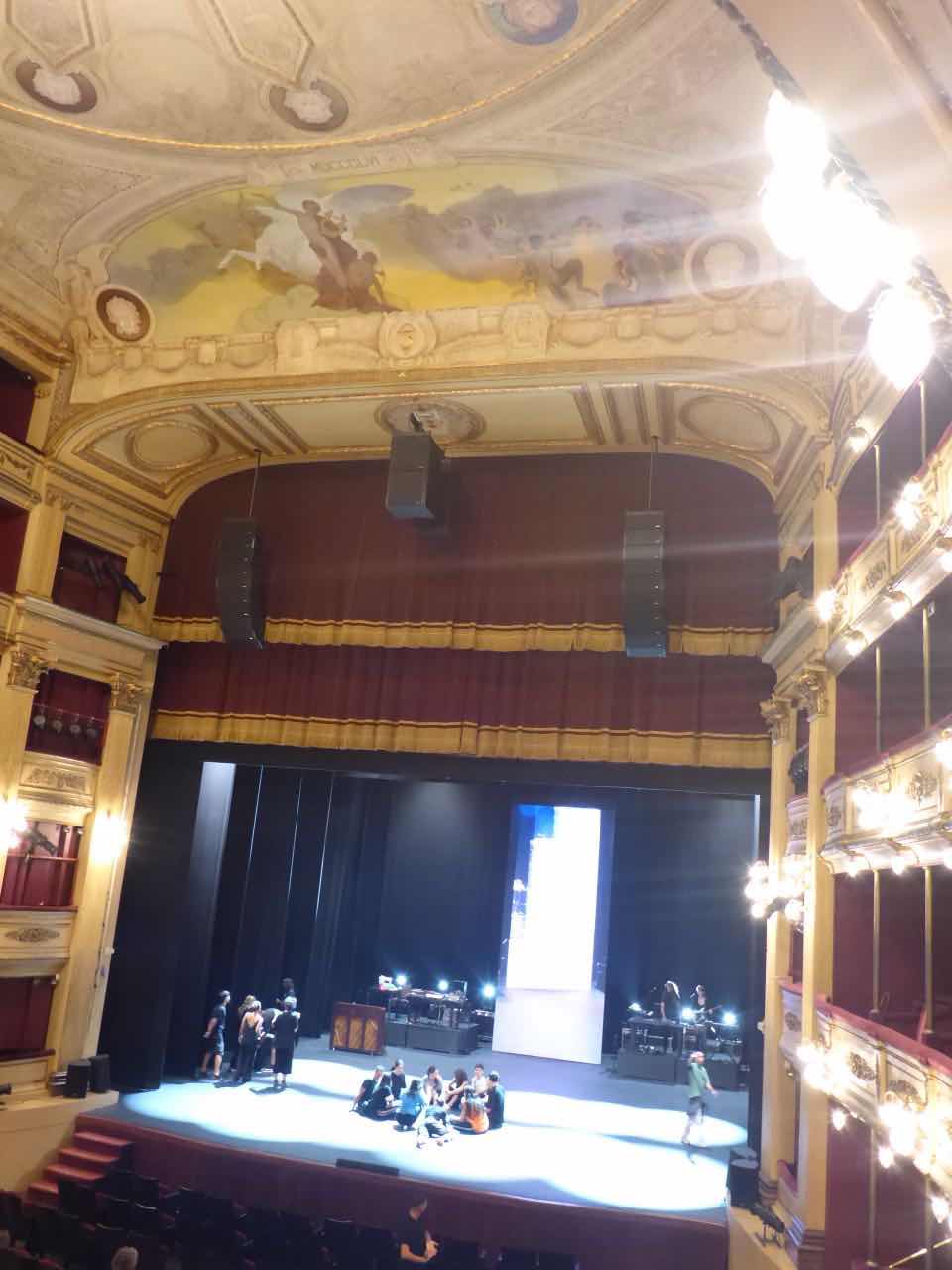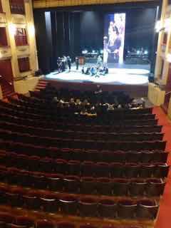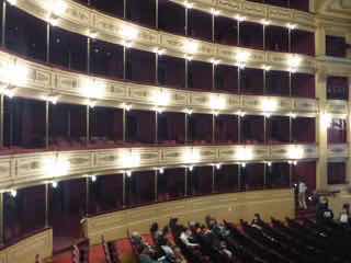 Wir lernen ein bisschen das Theater von Innen kennen, es gibt einen Theaterbereich, der für Proben benutzt wird, der aber auch wie ein kleines Theater mit Bühne und Sitzplätzen ausschaut und dann gibt es natürlich den großen Saal. Der ist sehr prächtig und hufeisenförmig geformt. In mehreren Etagen sind die einzelnen Logen und der Erläuterung nach ist das ganze Theater konsequent auf Akustik hin gebaut. Man kann von jedem Platz problemlos der Handlung folgen, ohne dass irgendwelche Mikrofone oder Verstärker benutzt werden.