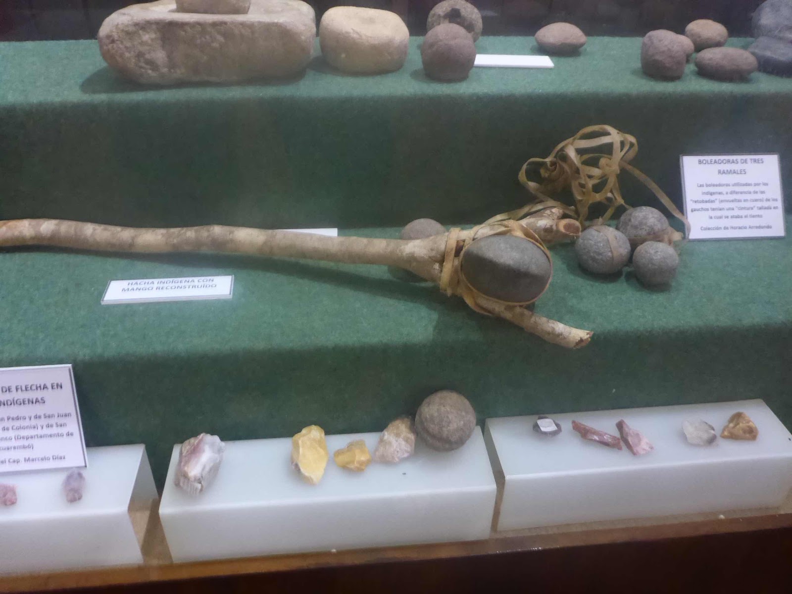 Spannend fand ich auch, dass in einer Vitrine auch die Waffen der Indigenen gezeigt wurden. Natürlich Pfeilspitzen, aber auch eine Art Streitaxt, wo ein Stein an einen dicken Ast gebunden wurde, der oben eine V-förmige Gabel hatte. Außerdem auch noch diese Kugeln, ich glaub, Bolas heißen die. Sie werden (von Könnern) herumgeschleudert und dann geworfen. Wenn das funktioniert, wickeln sich die Steine um die Füße und bringen das Tier oder den Gegner zu Fall.