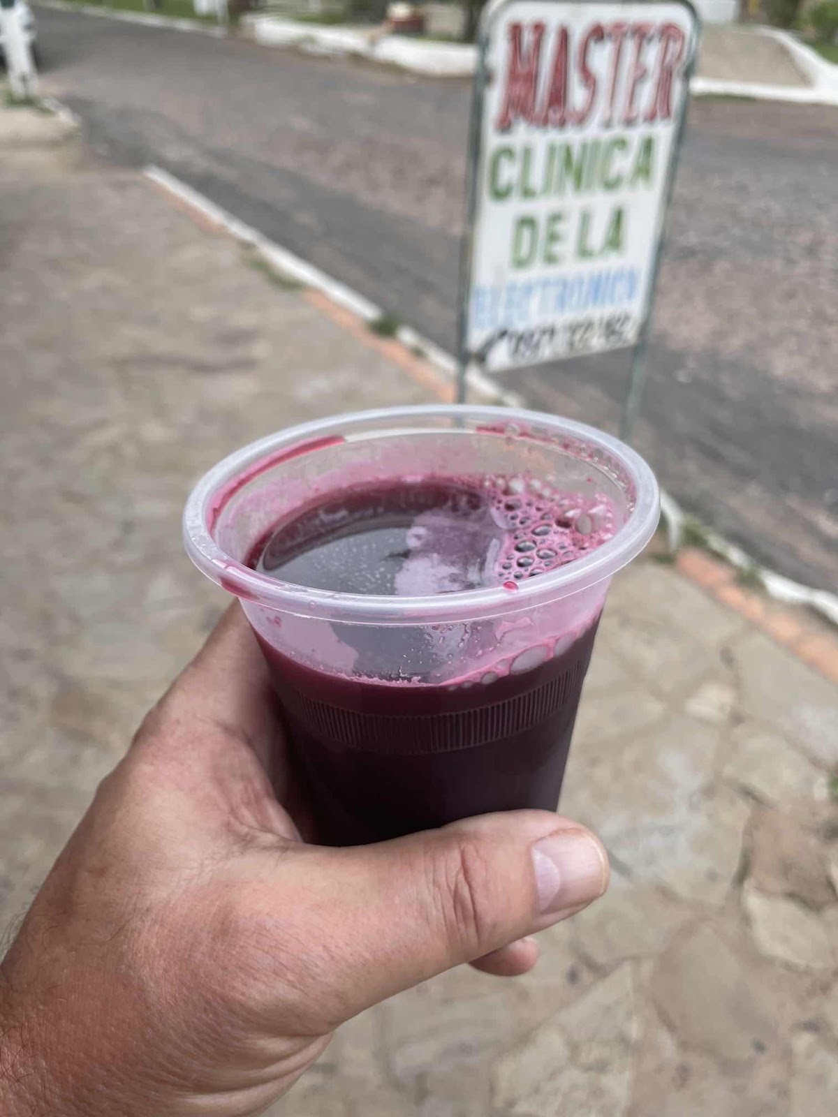 Habe ich schon gesagt, dass es warm ist? Warm und drückend. Ich komme an der Straße an einem kleinen Shop vorbei da standen zwei Krüge: einer mit einer gelben Flüssigkeit gefüllt, der andere mit einer roten. Kalt sah das aus. Ich fragte, was das kostet, und es waren 5:00 Guaranies. Dann erklärte mir die Frau, dass das gelbe Ananassaft sei. Und das rote habe ich nie verstanden.