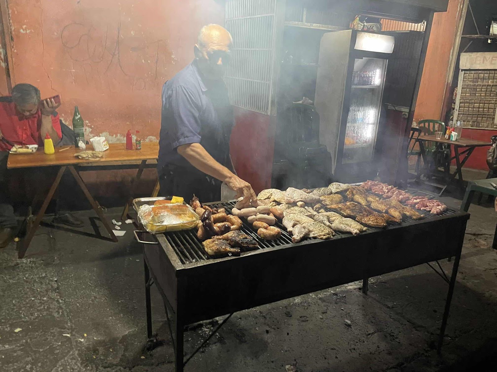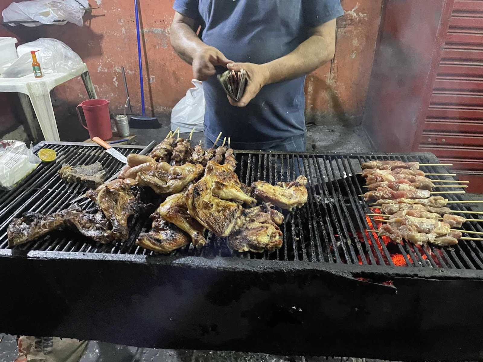 Das war ja super! Ich ging einmal die Straße hoch und runter, hatte dann aber schnell mein Herz verloren an einen Mann, der auf seinem Grill Spieße, Würstchen und Hühnerschenkel liegen hatte.