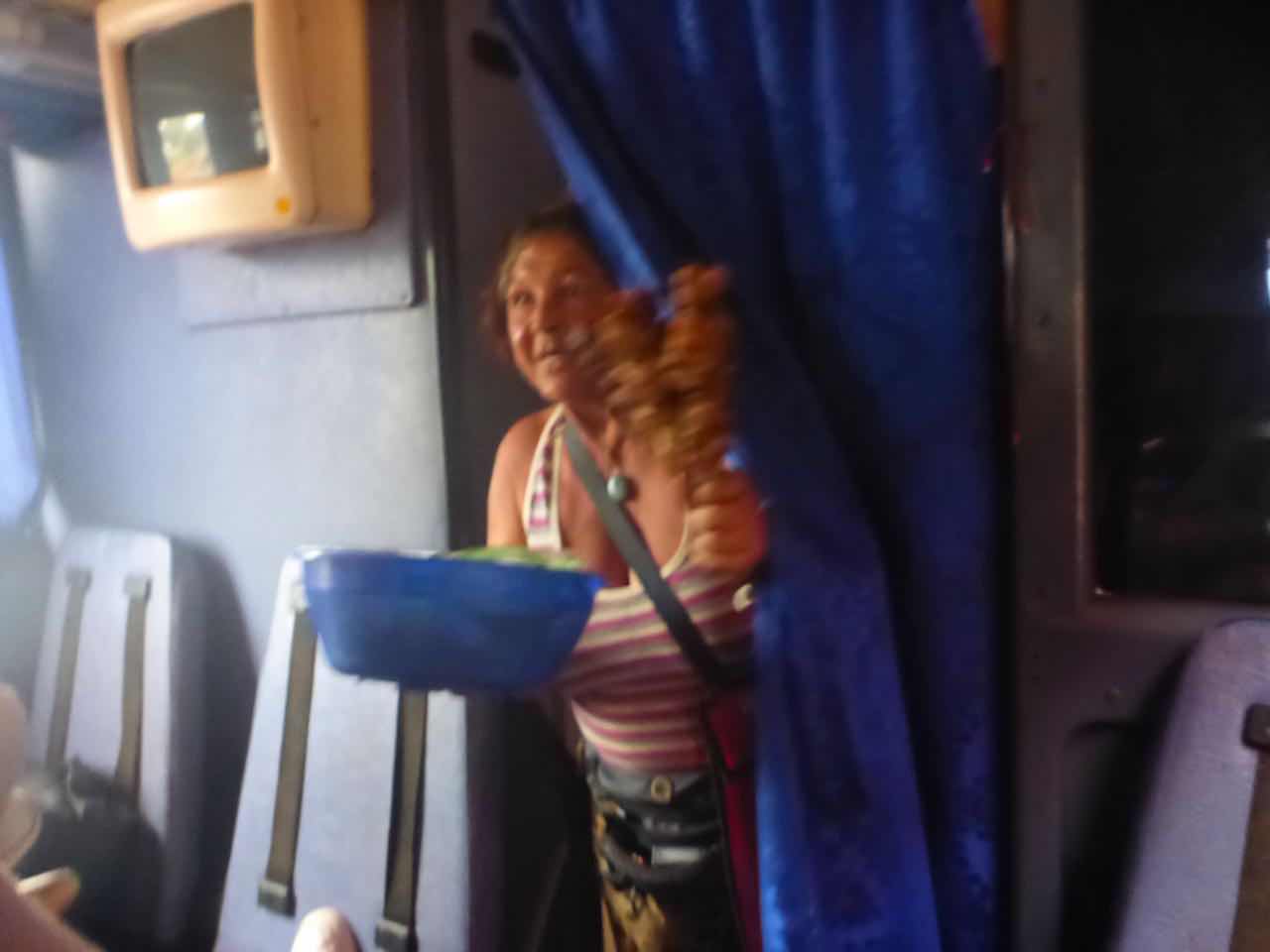 Natürlich gibt es hier auch Werbeunterbrechungen. Wir halten an und Händler stürmen den Bus mit Speisen, Getränken und allerlei Tinnef.