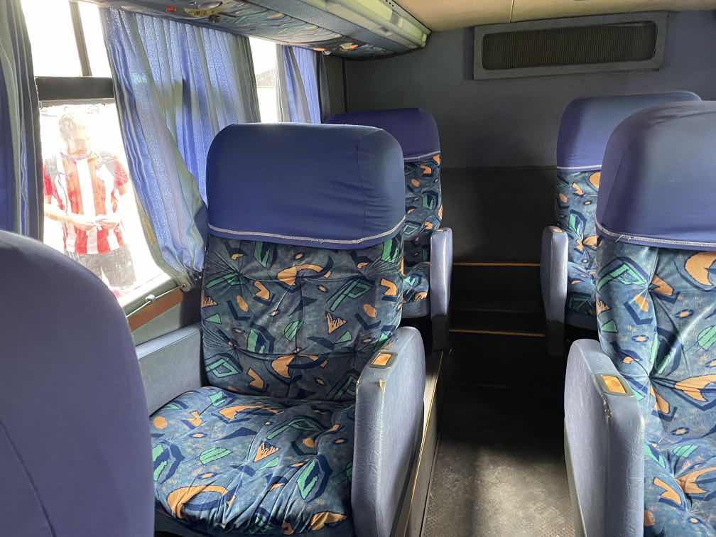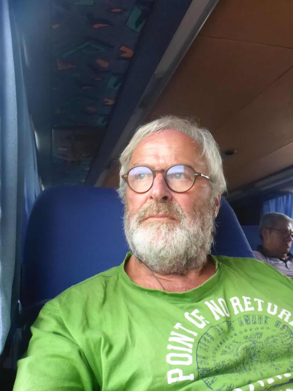 Halbwegs pünktlich kommt der Bus. Es ist ein großer Reisebus (Doppeldecker), der schon sehr lange sein Gnadenbrot verdient hätte, aber nein: er muss noch Dienst tun.