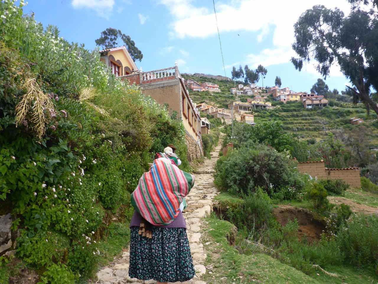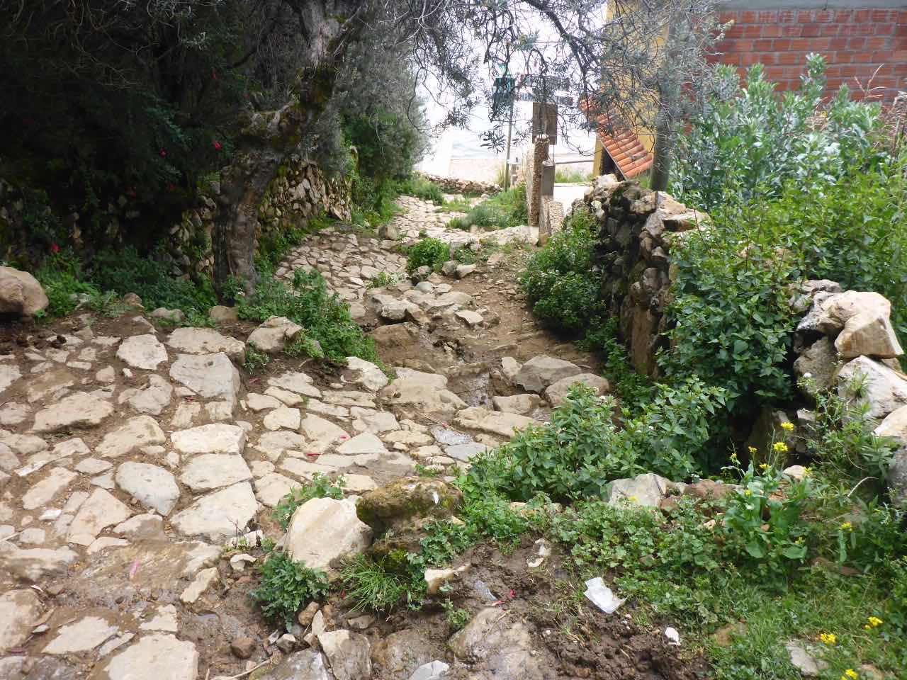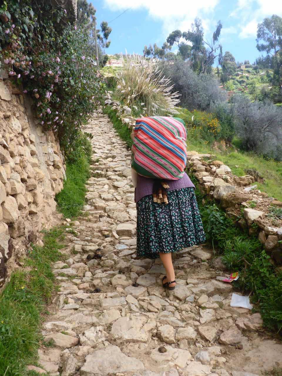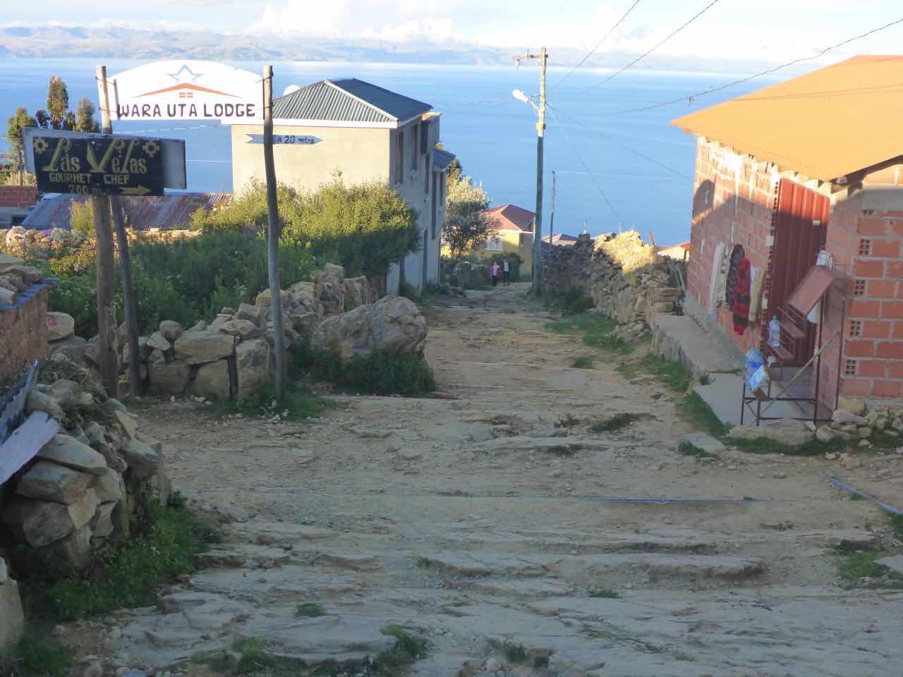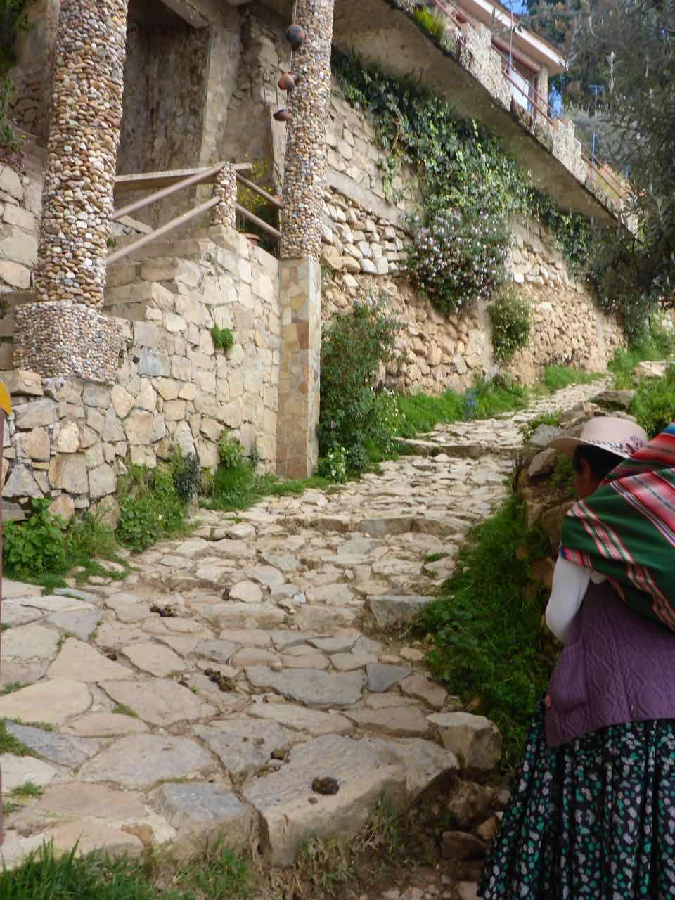 Aber wo Sonne ist (Sonneninsel) ist auch Schatten. Die Unterkunft, die ich hier in Yumani gebucht habe, schrieb mir, ich solle wenig Gepäck mitbringen, da der Weg zum Dorf über einen alten Inka-Pfad führt und dass man dafür ca. 25 Minuten braucht. Er ginge überwiegend bergauf über alte Treppenstufen im Fels. Als ich vor Jahren schon mal am Titicaca war, hatte ich den von der peruanischen Seite aus besucht. Und ich hatte auch da eine Tour zu der Insel Taquile gemacht, die mitten im See liegt. Vom Anleger aus ging es auch über eine mörderisch steile Strecke hinauf ins Dorf und am Schluss über eine fast 600 stufige Treppe, die wegen der Uneinheitlichkeit schwer zu gehen war (klettern wäre hier das bessere Wort). Hier gibt es also auch eine Treppe. Spannend. 25 Minuten lang Treppensteigen in einer Höhe von ca. 3800m. Man kann sich das Leben auch schwer machen…