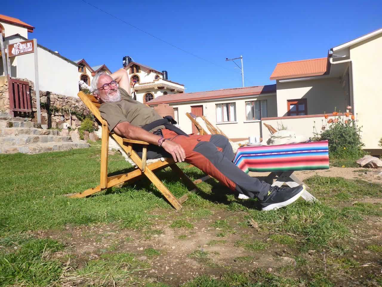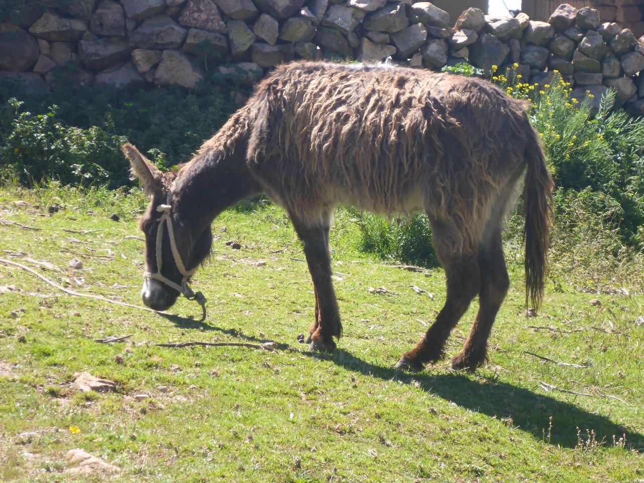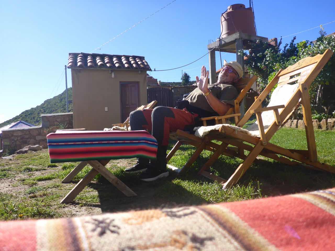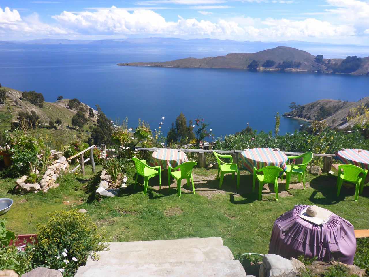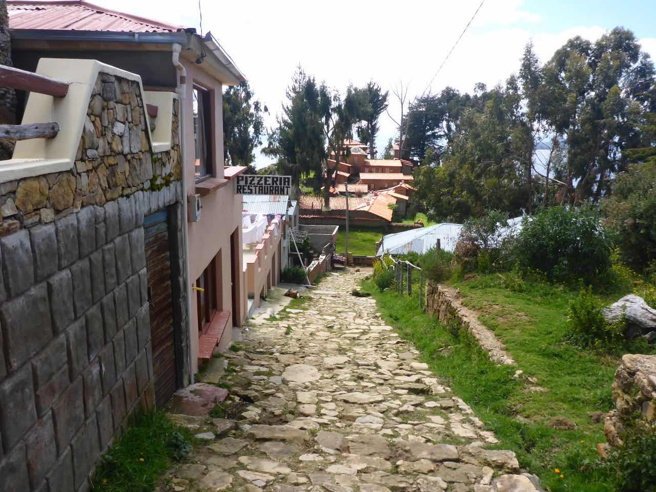 Aber wo Sonne ist (Sonneninsel) ist auch Schatten. Die Unterkunft, die ich hier in Yumani gebucht habe, schrieb mir, ich solle wenig Gepäck mitbringen, da der Weg zum Dorf über einen alten Inka-Pfad führt und dass man dafür ca. 25 Minuten braucht. Er ginge überwiegend bergauf über alte Treppenstufen im Fels. Als ich vor Jahren schon mal am Titicaca war, hatte ich den von der peruanischen Seite aus besucht. Und ich hatte auch da eine Tour zu der Insel Taquile gemacht, die mitten im See liegt. Vom Anleger aus ging es auch über eine mörderisch steile Strecke hinauf ins Dorf und am Schluss über eine fast 600 stufige Treppe, die wegen der Uneinheitlichkeit schwer zu gehen war (klettern wäre hier das bessere Wort). Hier gibt es also auch eine Treppe. Spannend. 25 Minuten lang Treppensteigen in einer Höhe von ca. 3800m. Man kann sich das Leben auch schwer machen…