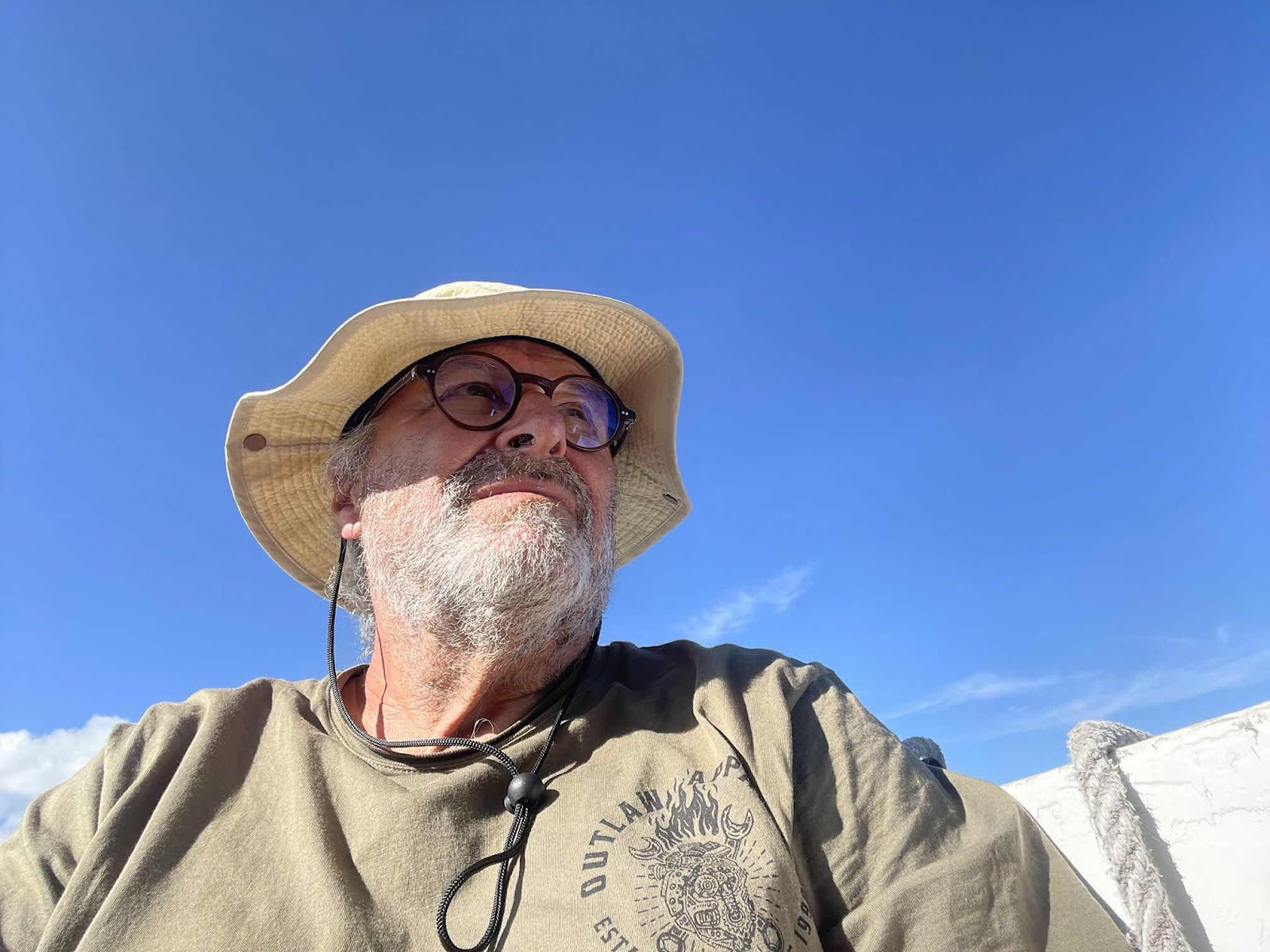 Der Fahrgastraum war schon voll, und auf dem Dach wollte ich nicht sitzen, also blieb ich im Cockpit. Wir legten ab und schon nach kurzer Zeit schickt der Captain zwei weitere Leute aus dem Cockpit oben auf das Dach. Er wollte mich auch da hochjagen, aber ich sagte: nein nein ich bleib hier sitzen.