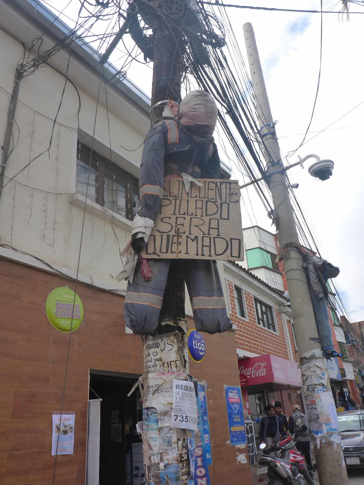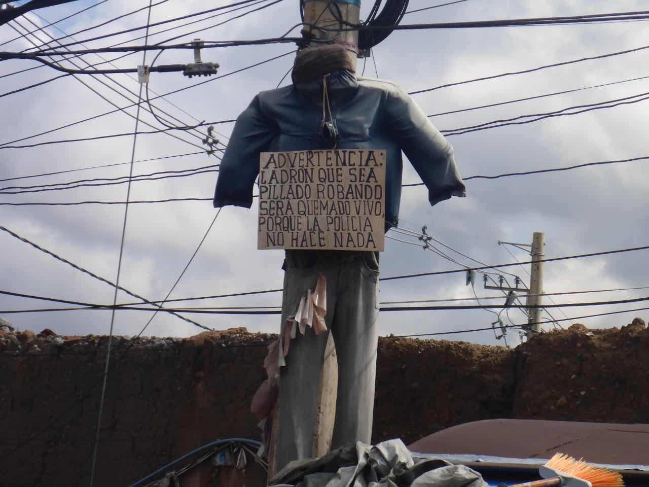 An mehreren Laternenpfählen sind Puppen aufgehängt. Sie haben alle ein Schild um den Hals, und auf einem steht „Gefangen genommener Verbrecher wird verbrannt“, auf einem anderen „Warnung: Jeder beim Stehlen erwischte Dieb wird lebendig verbrannt, weil die Polizei nichts unternimmt.“ offensichtlich versteht man hier keinen Spaß.