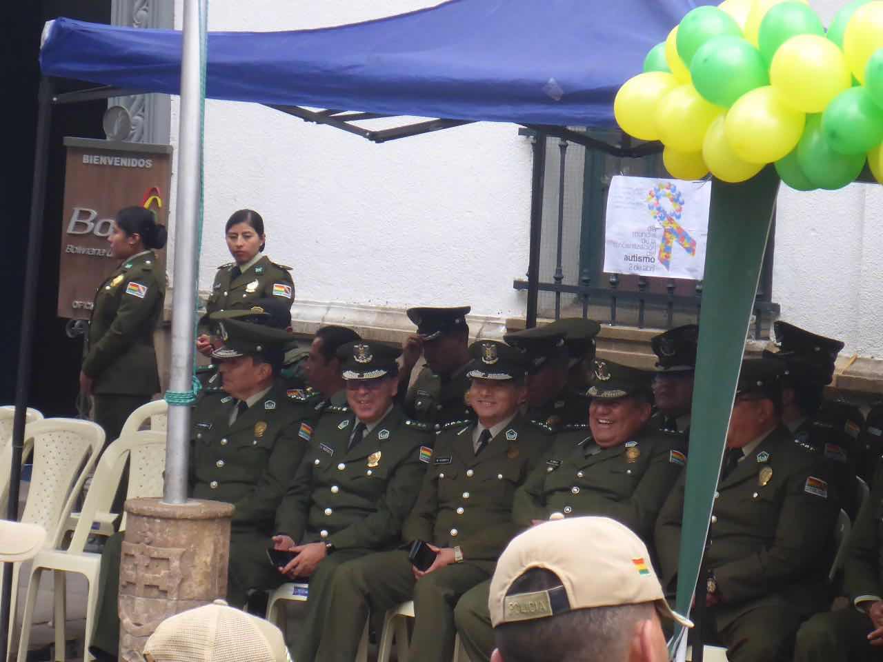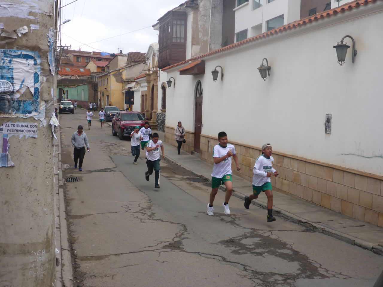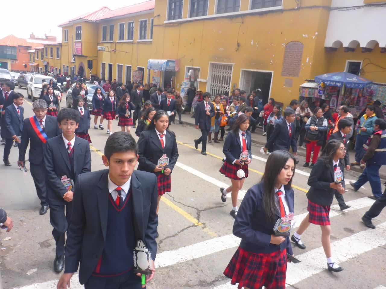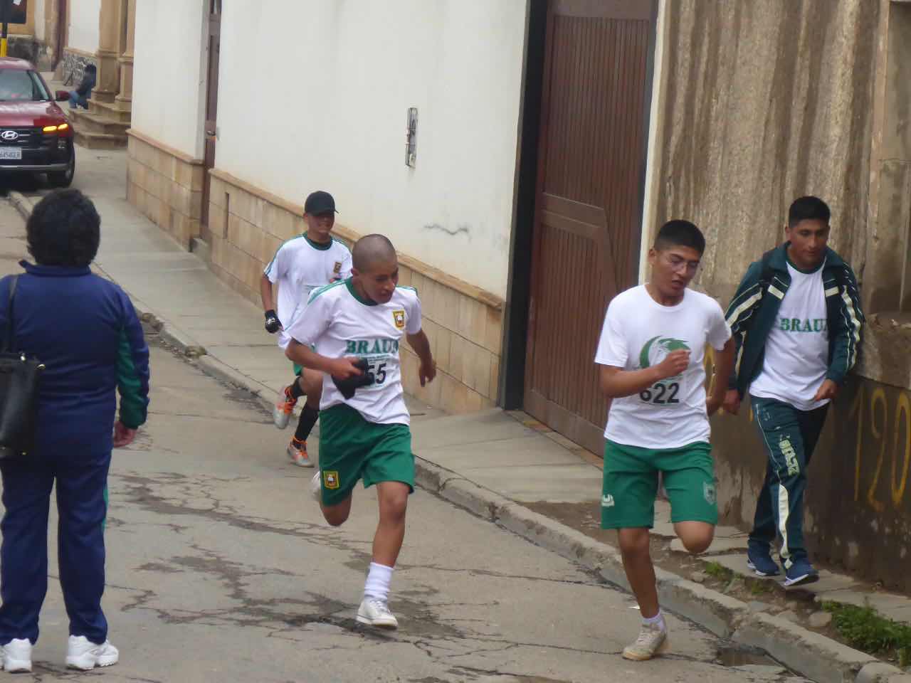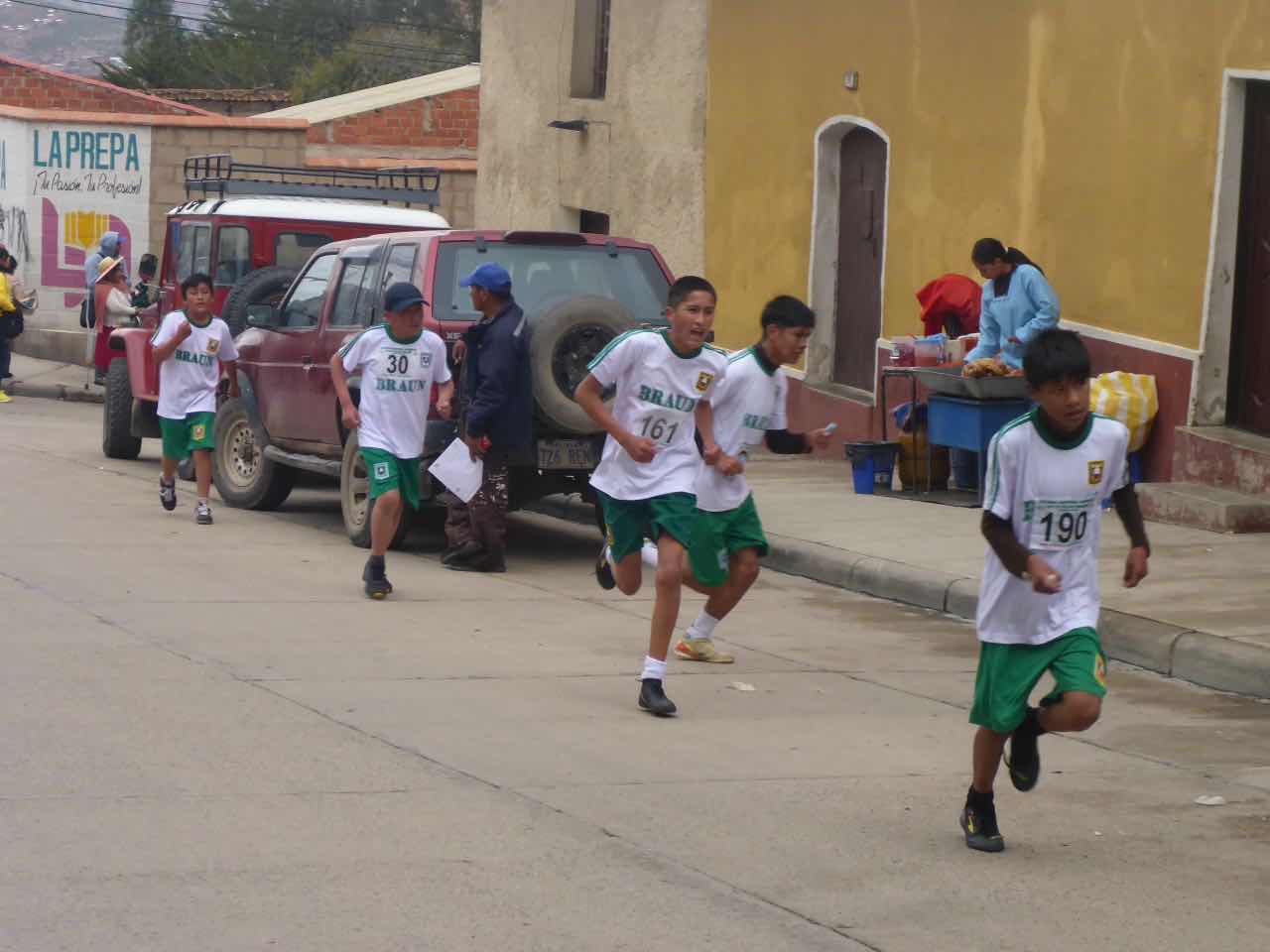 Deshalb wird meine rote Jacke, die mich schon lange begleitet hat, in Bolivien bleiben . Und dann begegne ich noch mehr Festivitäten. Dieser Wettlauf der jungen und jetzt ziehen großen Mengen von Schülern mit den Abzeichen ihrer Schule durch die Straßen. Später ehe ich auch noch Schülerinnen.