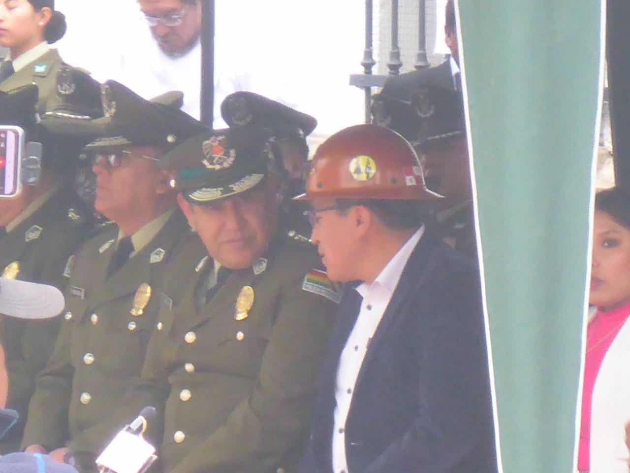 Als ich dann losgeht, nehmen die Soldaten Haltung an und nehmen (sehr beunruhigend) ihre Maschinenpistolen in den Anschlag. Dann kommen aus dem Präsidium weitere Würdenträger und einer davon trägt einen Grubenhelm. Ich gehe nun, weil dann die Reden anfangen.