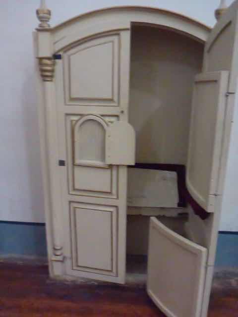 Lustig war auf eine Geschichte von einer einem aufklappbaren Beichtstuhl. Er ist zwar fest montiert an der Wand, aber sieht nur aus wie ein flacher Schrank und nimmt so wenig Platz weg. Bei der Konstruktion hat man aber übersehen, was an dieser Stelle eine gute Akustik war. Wenn dann der Beichtstuhl in Betrieb war, konnten auch die anderen Leute in der Kirche recht gut mithören, was so gewesen ist letzten Wochen.