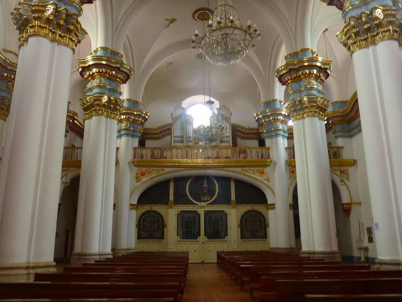 Sie ist nichts mehr groß, aber recht prunkvoll geschmückt. Im Seitenschiff gibt es einige Seitenaltäre, er macht mich darauf aufmerksam, dass zwei davon aus der ursprünglichen Kathedrale aus dem Jahr 1564 sind. Dann machen wir uns auf, den Turm zu besteigen.