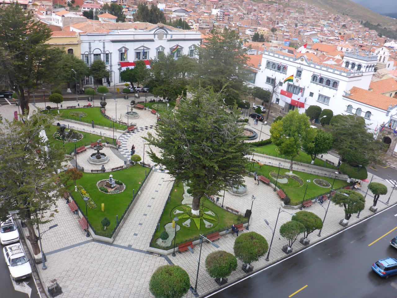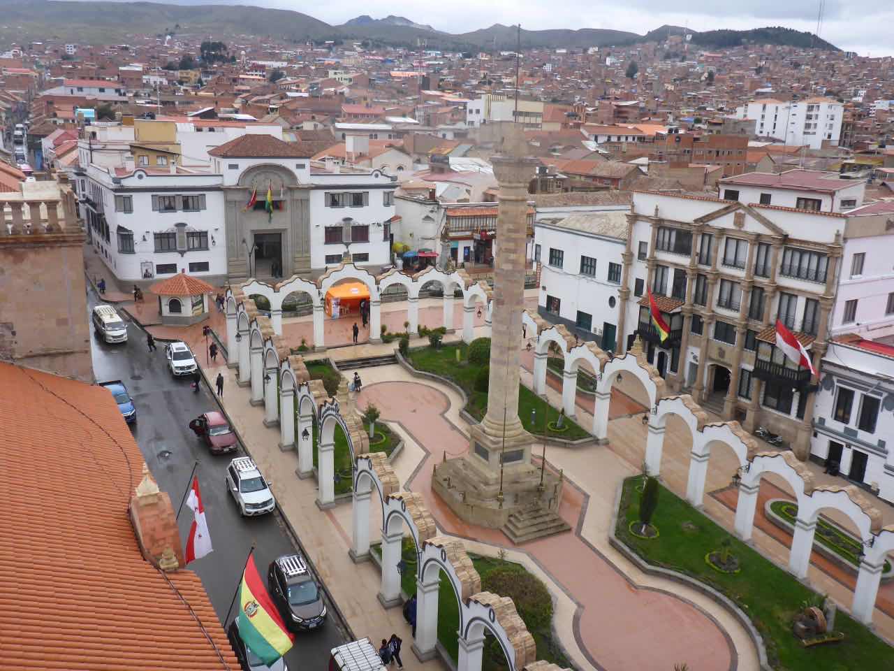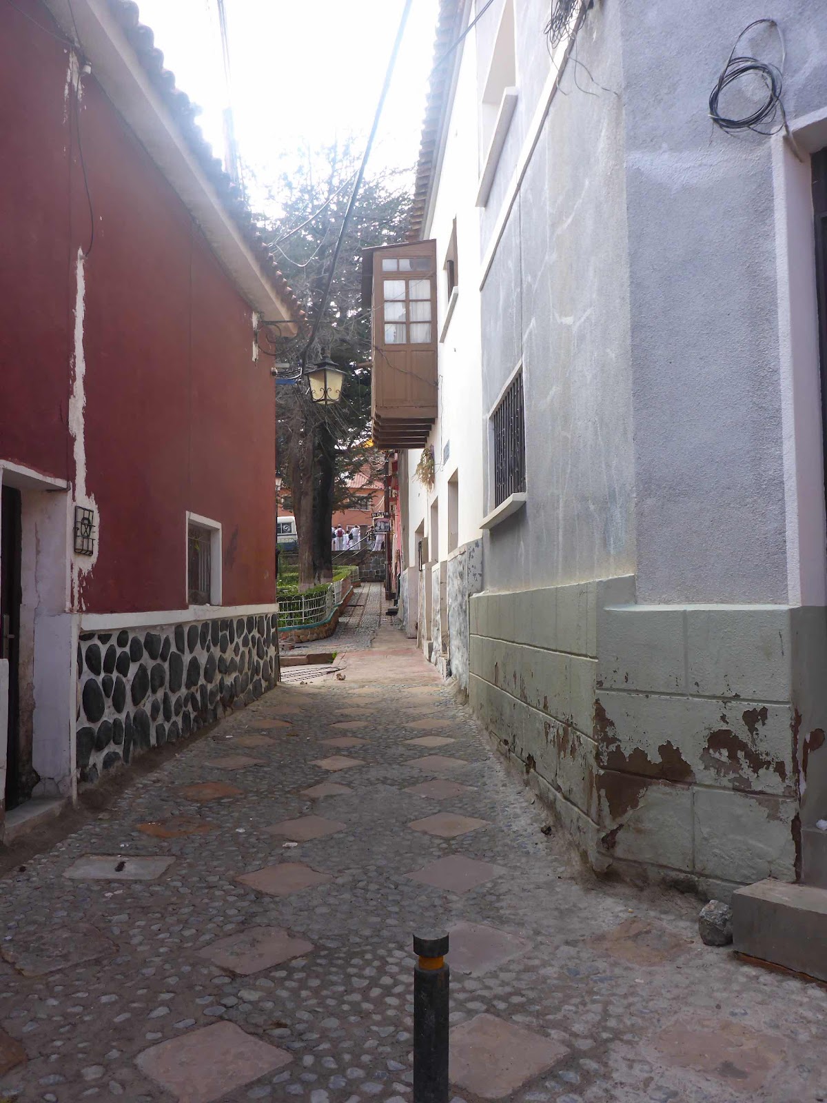 Der junge Mann, der da sitzt, ist sichtlich überrascht, einen Besucher zu sehen. Ich sage ihm, dass ich gern die Kathedrale und auch den Turm sehen würde. Er knöpft mir 20 Bolivanos ab und zu meiner Überraschung verlassen wir beide zusammen sein Büro, und er schließt es hinter sich ab. Dann gehen wir durch einen Innenhof über einen Hintereingang in die Kathedrale.
