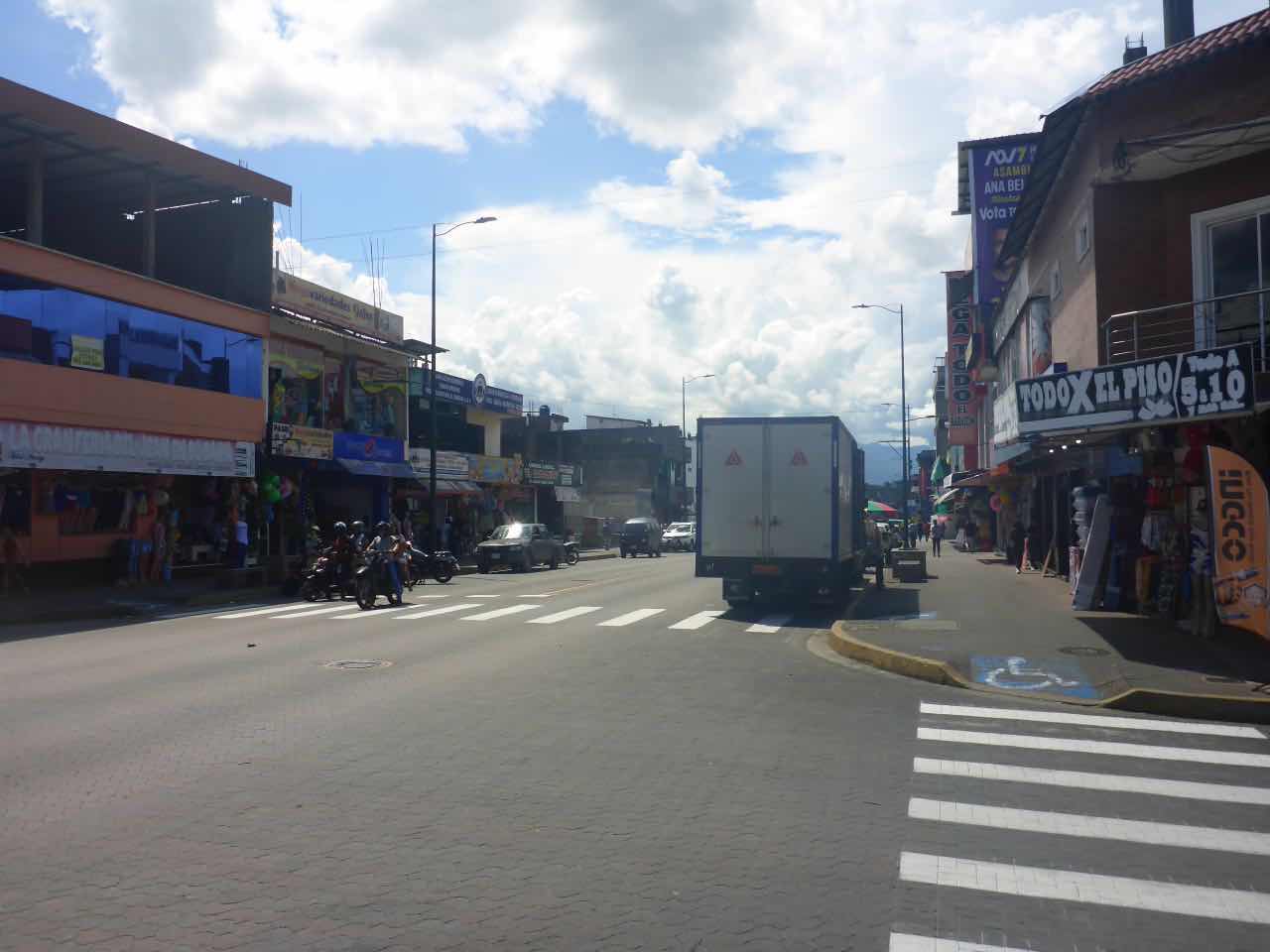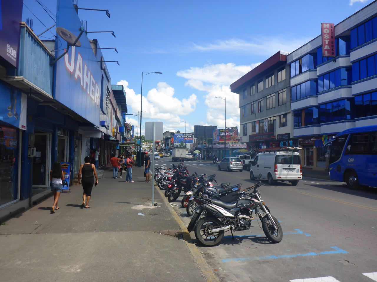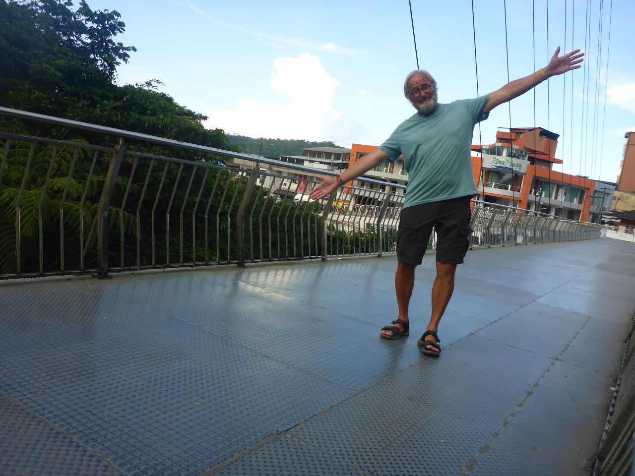 Hier in der Stadt gilt es laut Michael einen Standardpreis für die Taxen. Tagsüber 1,25, abends 1,50. Da das letzte Stück zur Herberge einen Berg hochgeht, erscheinen mir 1,50 nicht besonders viel. Zumal Tena auch nicht die sicherste Stadt in Ecuador ist. Michael meint, nach 10:00 Uhr sollte man sich auf keinen Fall mehr auf der Straße aufhalten, weil die dann den Drogenbanden gehört. Die lassen zwar Touristen normalerweise in Ruhe, aber wenn man zur falschen Zeit am falschen Ort ist, kann trotzdem etwas passieren. Die Gewalttaten in der Stadt haben zu einem ziemlich dramatischen Rückgang der ohnehin spärlichen Touristen geführt. Und diesen Eindruck habe ich auch, das hier ist keine Touristen Stadt, lediglich in dem in dem Kneipenviertel am Fluss habe ich Gringos gesehen. Ansonsten ist es hier ein wohltuendhomogener Ort von Leuten aus Ekuador. Und von Drogengangstern.
