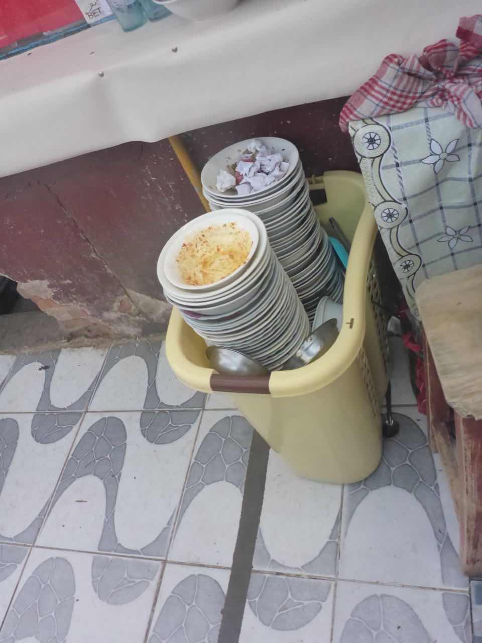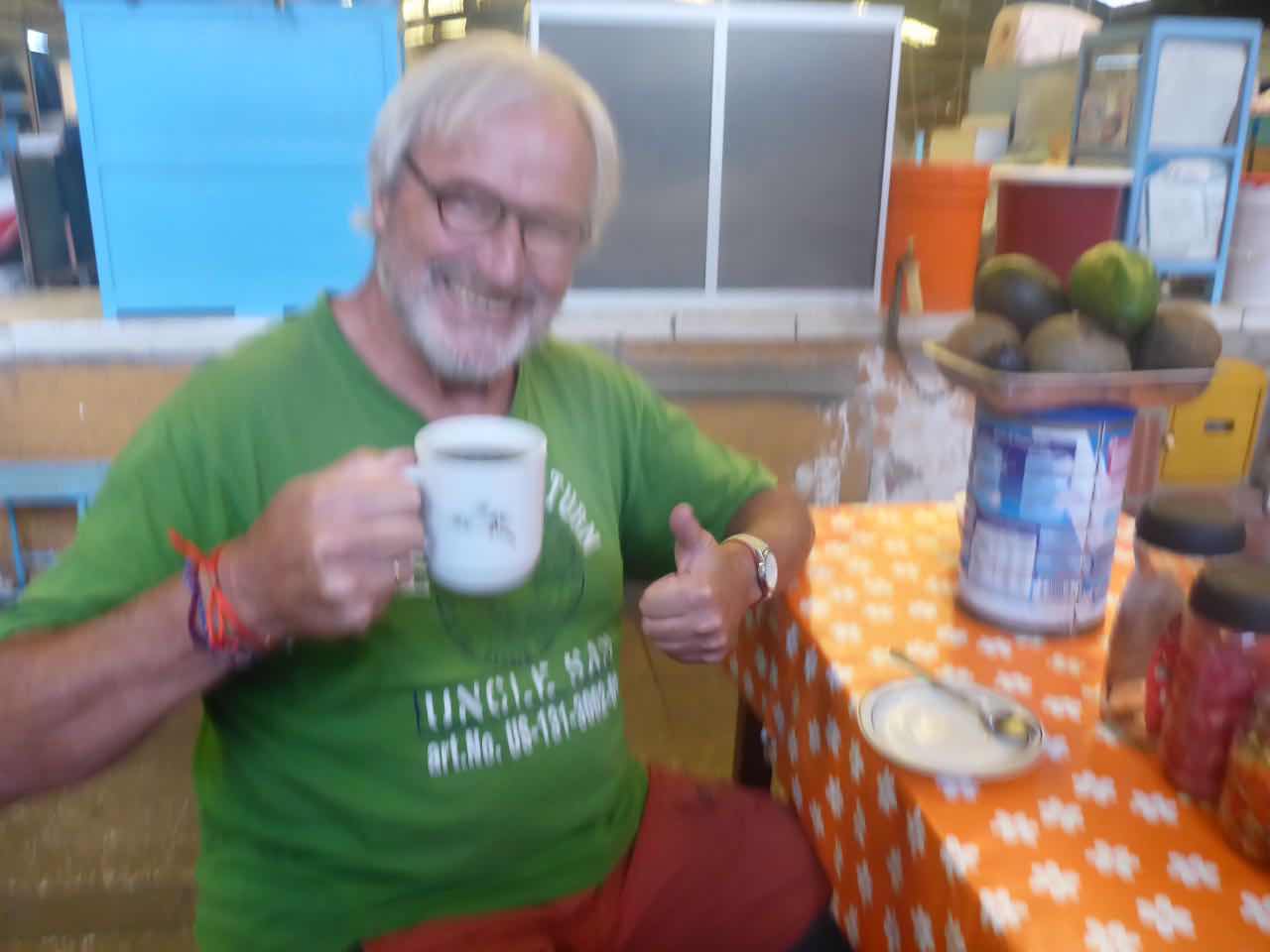 Der Regen kann was. In dem kleinen Markt, in dem ich jetzt bin, sitze ich trocken und es gibt einen kleinen Stand, wo gebackene Fladen verkauft werden. Die sind größtenteils aus Luft werden entweder mit Puderzucker bestreut oder man tut etwas Sirup drauf.