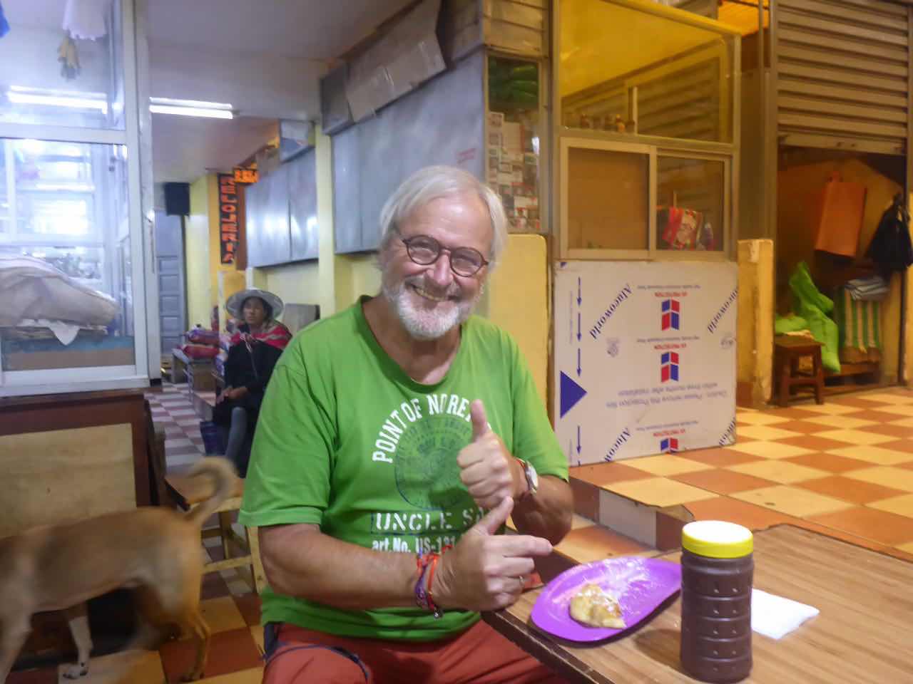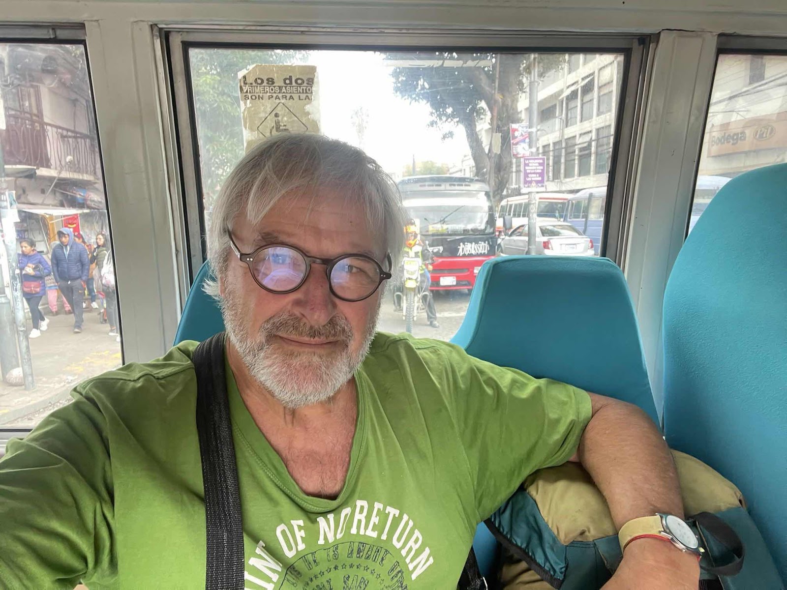 Er lächelte mich dabei so freundlich an, dass ich ihn gefragt habe, ob ich ein Foto machen darf. Er fragte dann zuerst seine Frau, aber die stimmte dem auch zu.Ich weiß, dass ich hier als Gringo ein Außenseiter bin und die Leute schauen auch etwas neugierig. Auch der Kokablätter-Fan dreht sich öfters zu mir um und lächelt dabei freundlich.