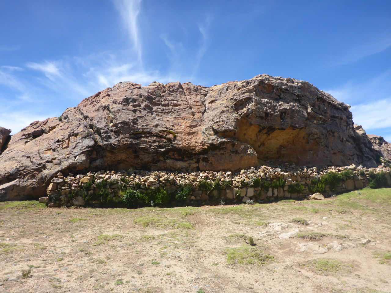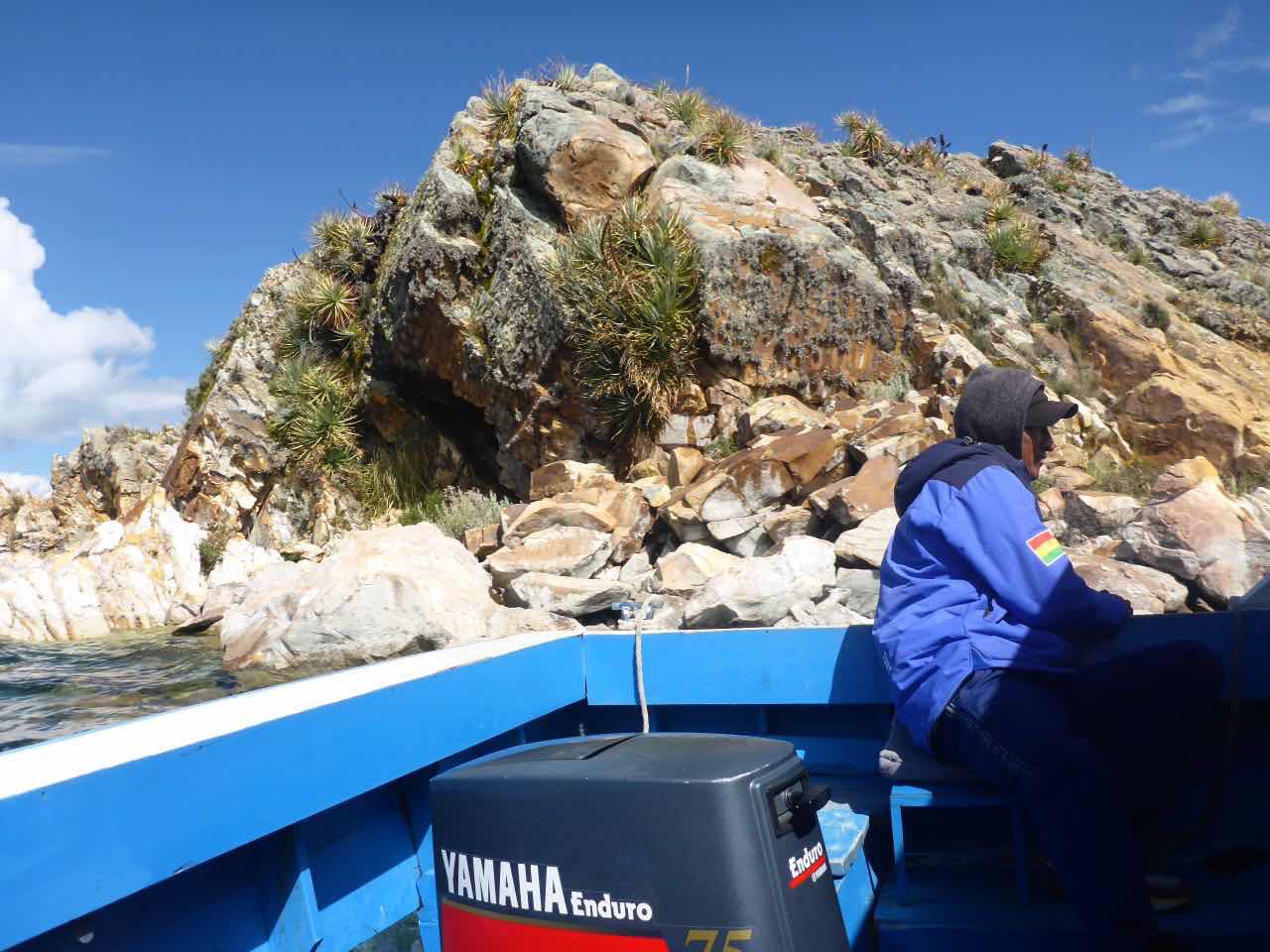 Wir sind in einem heiligen Felsen, der dem See den Namen gegeben hat. Mit viel Fantasie kann man dem Gestein einen Kondor erkennen, einen Puma und eine Schlange. Der Puma wird in der lokalen Sprache Titi genannt. Und Kaka ist die Schlange. Unten an der Felswand liegen viele kleine und größere Steine, das sind Wunschsteine. Man kann einen Stein nehmen, den dort hin bringen dann muss man für zehn 15 Sekunden lang eine Verbindung mit dem Felsen herstellen, indem man seine Hand darauf hält. Das habe ich natürlich getan, aber einen Wunsch behalte ich für mich.
