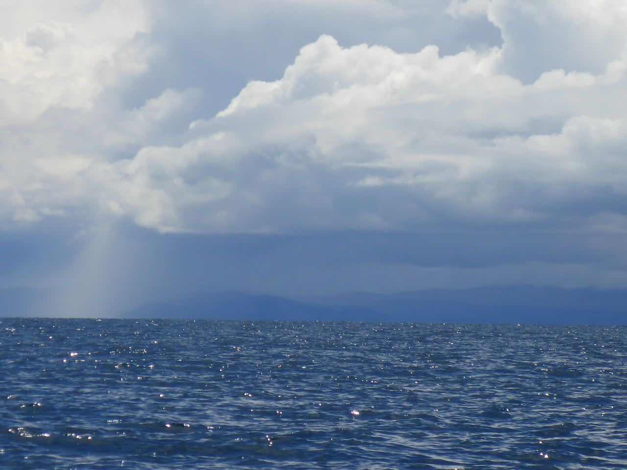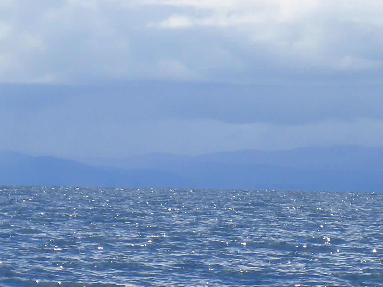 Ich würde gerne wissen, wie sie dahin geklettert sind, denn eine Treppe ist nicht zu sehen. Wenig später stellt sich heraus, dass es offensichtlich Familie ist. Der Großvater und die Frau von unserem Kapitän. Und das irgendwas in dem Tragetuch war ein zwei bis dreijähriges Kind. Wir fahren dann weiter über den See die Sonne scheint herrlich. Es ist richtig bullig warm, und im Hintergrund sind die schneebedeckten Berge. Ein tolles Panorama.