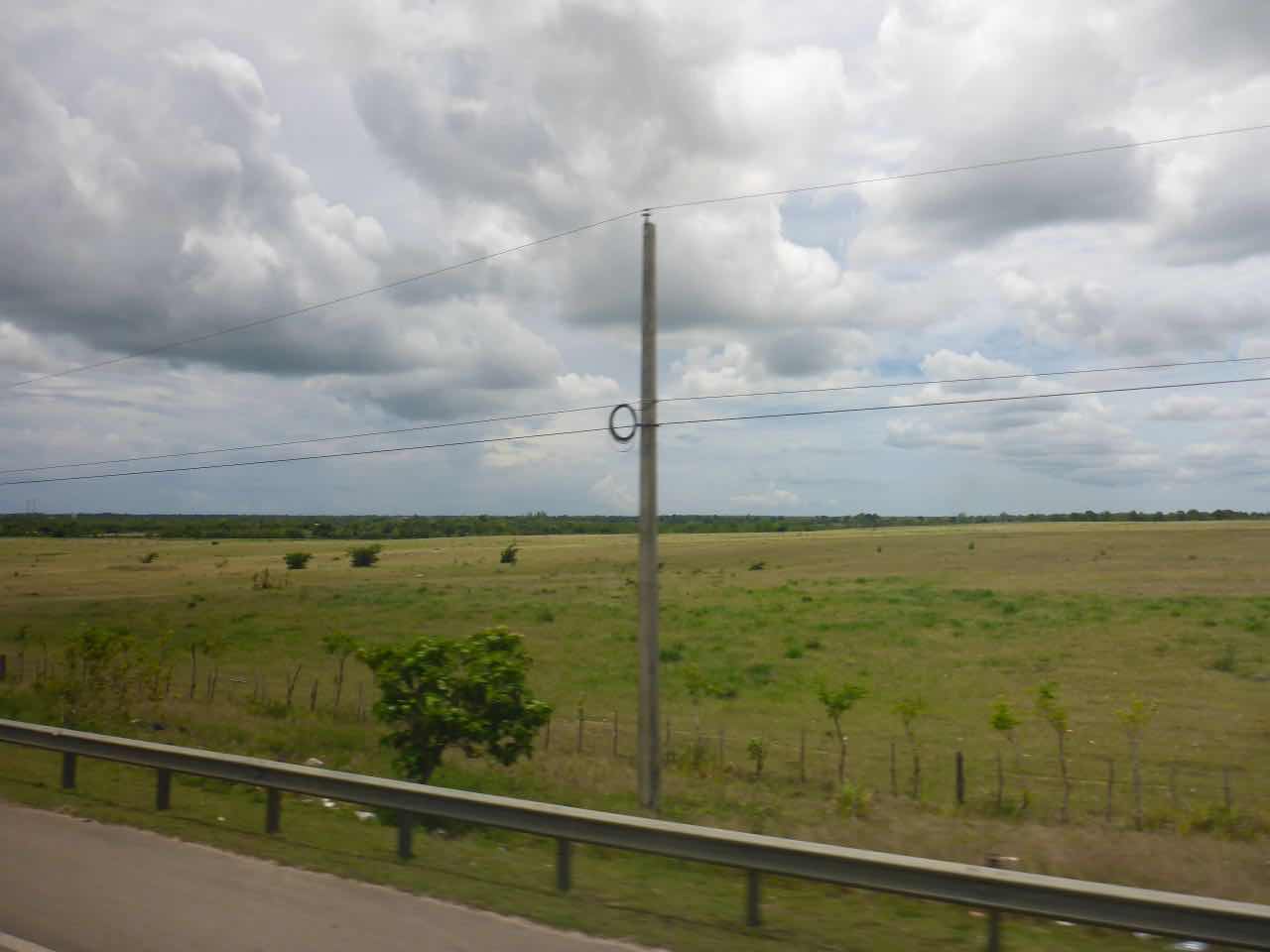 Wir gehen bald auf dem Highway drei sehr entspannt und gleichmäßig in Richtung Santo Domingo. Die Fahrt ist echt langweilig, weil es nicht viel zu sehen gibt. Es ist hier alles sehr flach, manchmal sieht man Felder und manchmal einfach nur Gras und Gebüsch. Es ist immer noch sehr wolkig sieht recht grau aus.