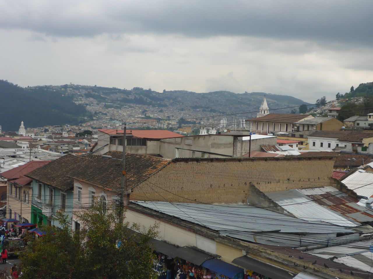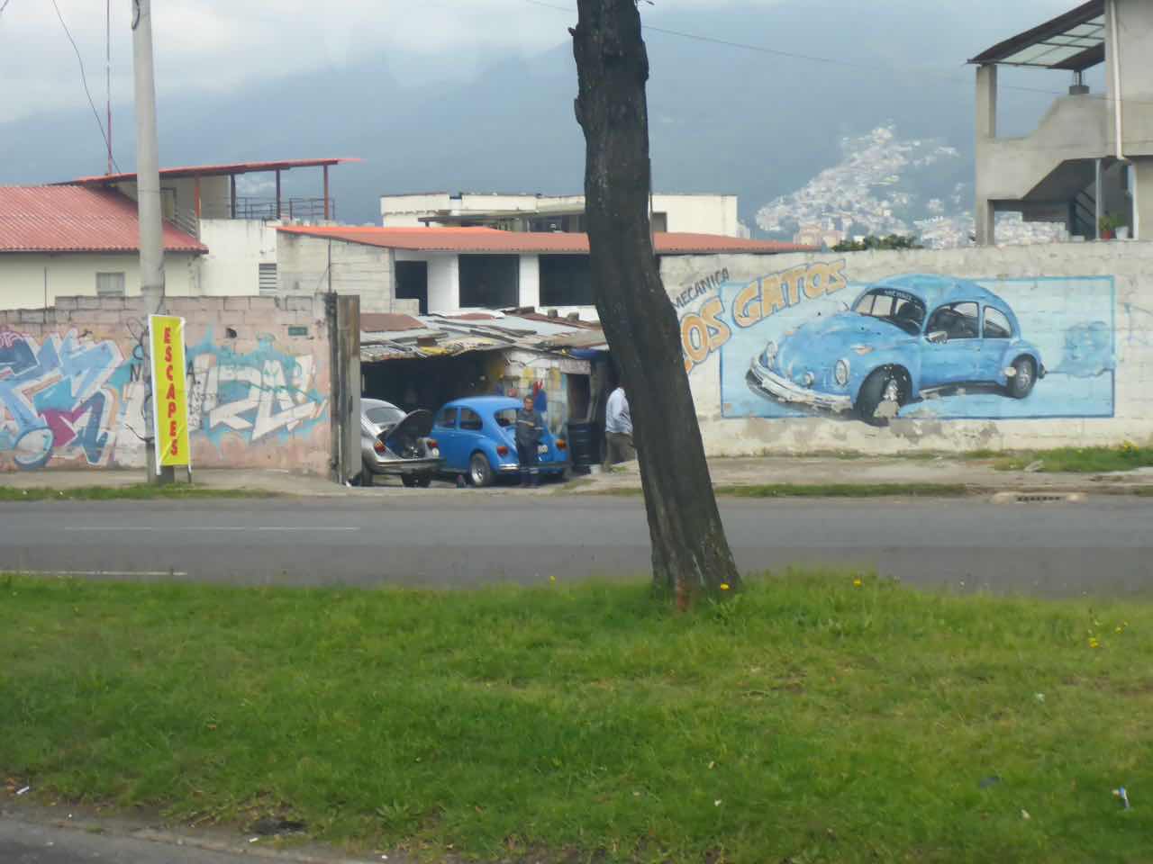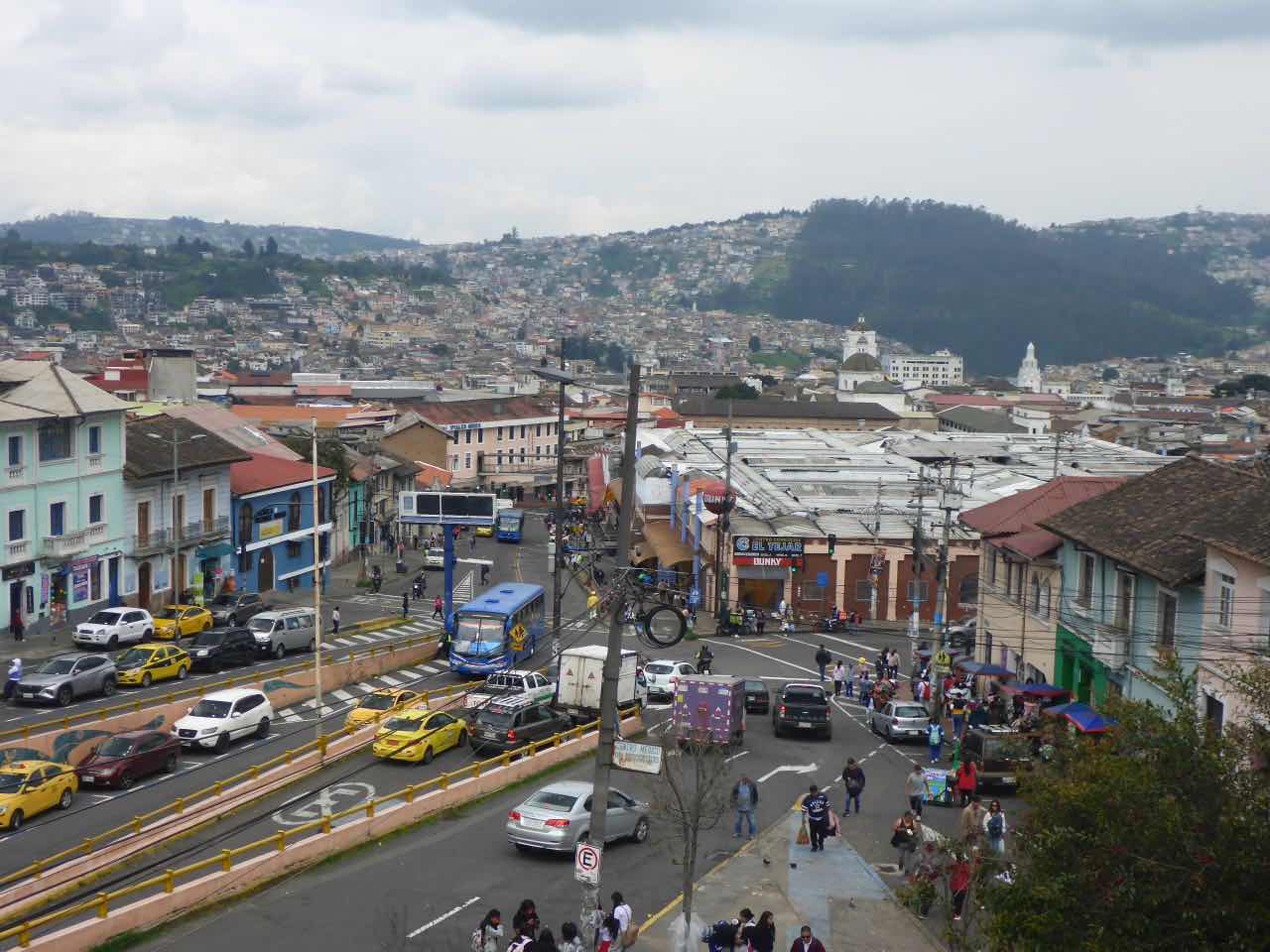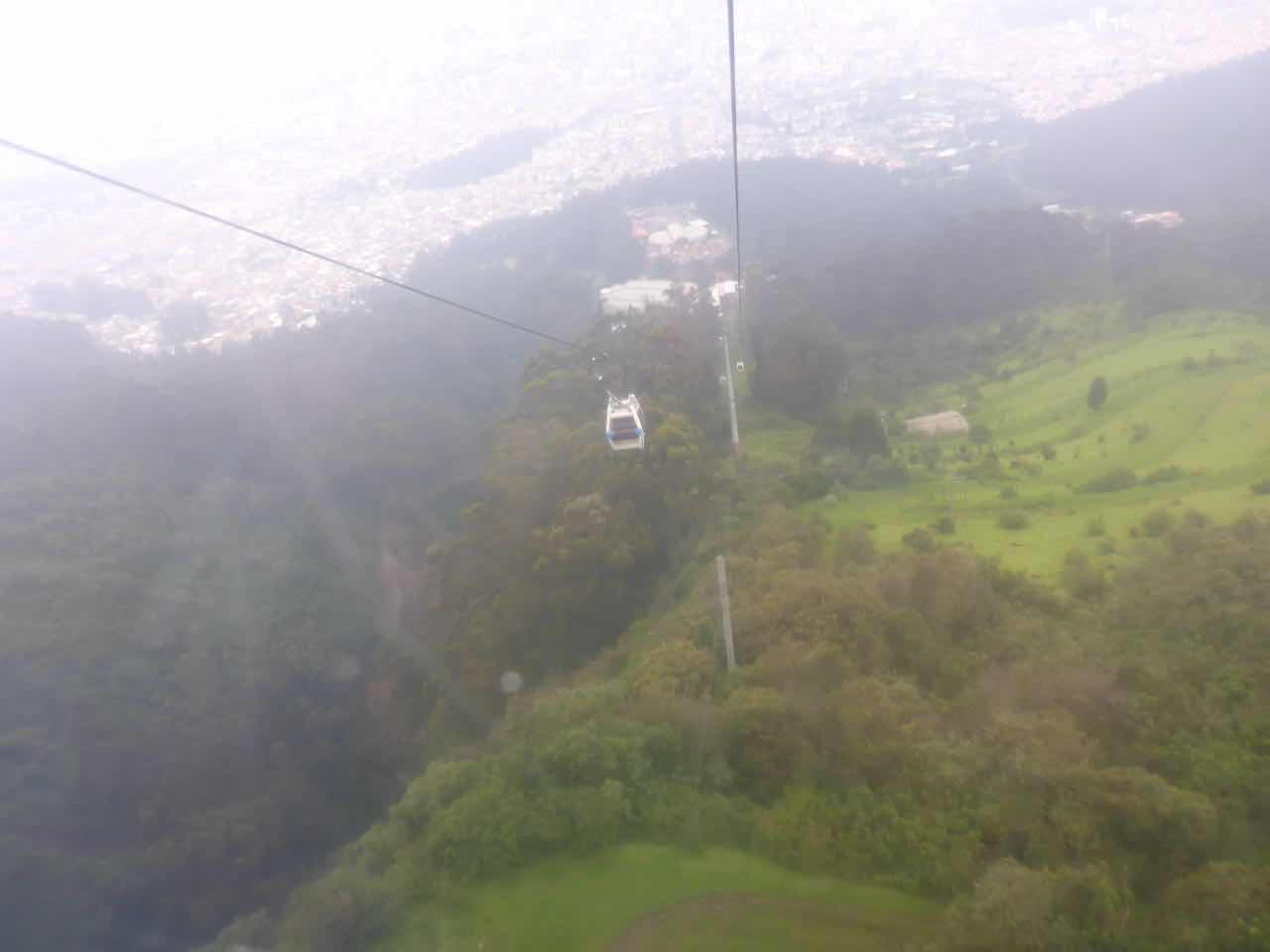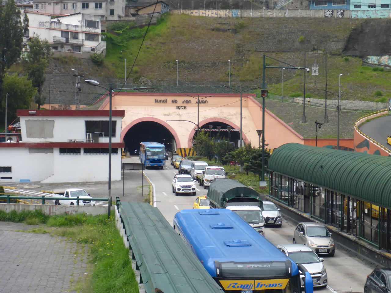 Auf diesem Touren sehe ich natürlich relativ viel von Quito. Es ist eine durchaus moderne Stadt. Der Verkehr ist aber auch wie in einer modernen Stadt. So richtig schön kann ich die Stadt nicht finden, aber ich erkenne schon, dass sie viele Gesichter hat. Quito scheint wirklich sehr groß zu sein. Wir fahren immer höher und immer höher und offensichtlich geht die Strecke über einen Bergrücken, weil manchmal kann ich links unten Quito sehen und manchmal rechts. Ich schätze, dass wir 300 m bis 400 m über der Stadt sind.Aber natürlich sind wir immer noch in der Stadt.