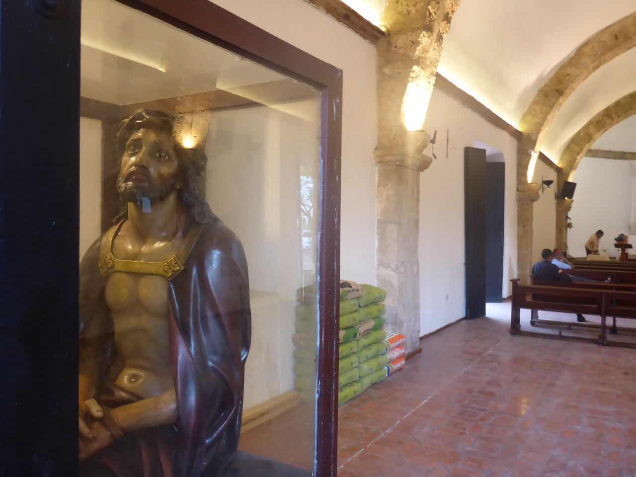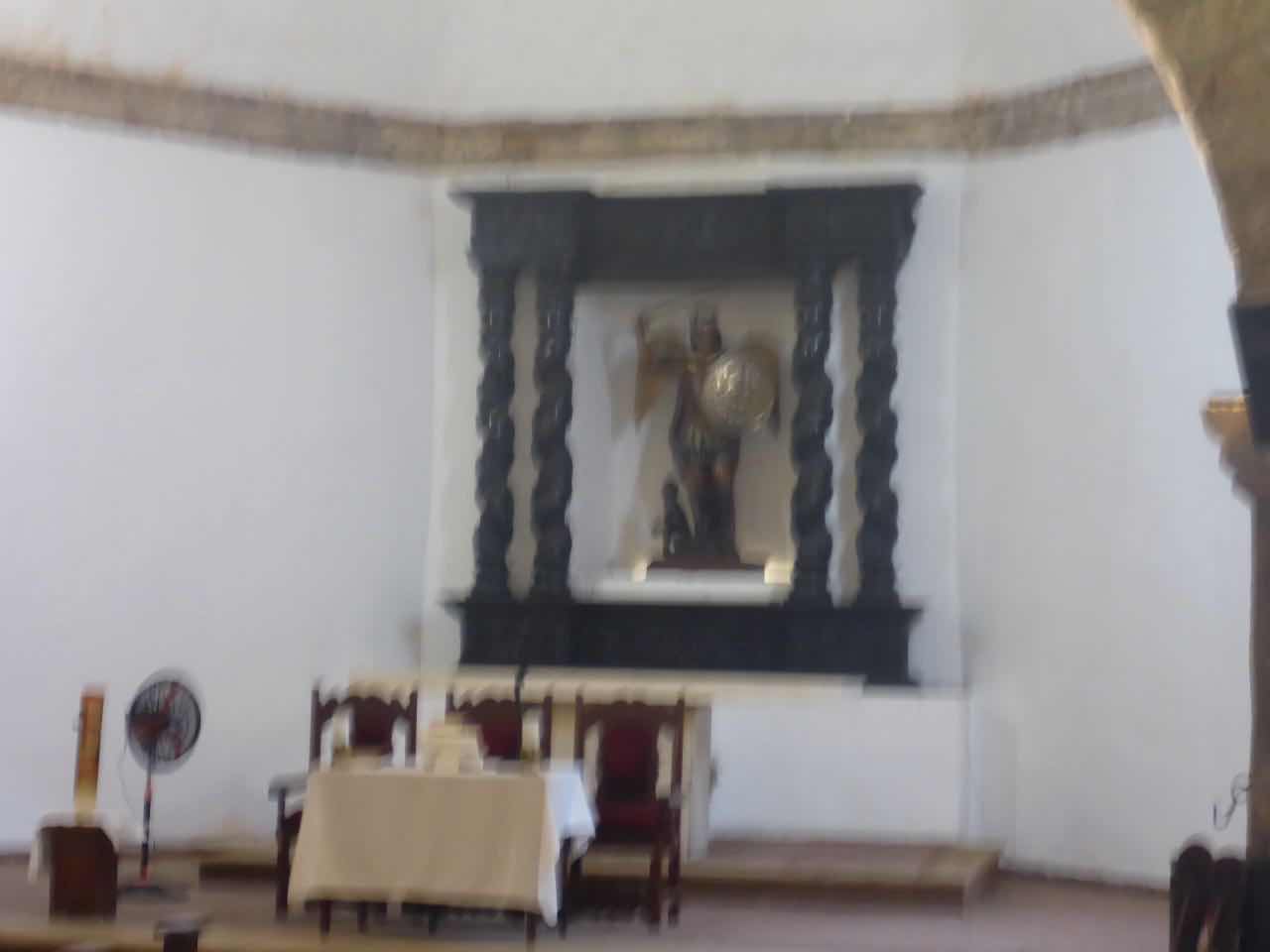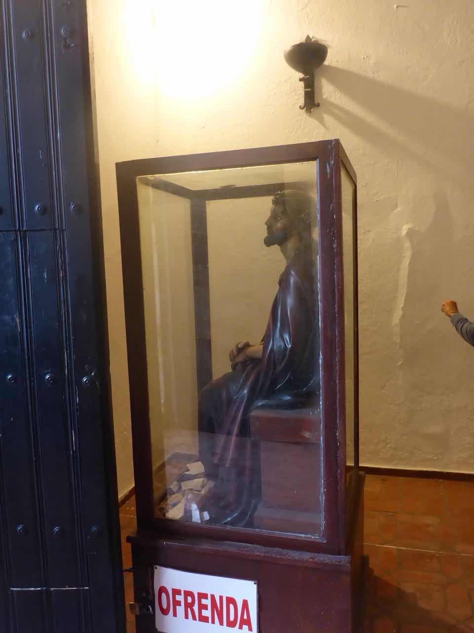 Dann kam ich noch an der kleinen, alten Kirche (Iglesia de san Miguel) vorbei. Es ist ein sehr kleines Haus, sehr schmucklos und es hat diesmal auch kein Kreuz, sondern über dem Altar einen heiligen Miguel. Einen sitzenden Jesus gab es auch, aber er schaute sehr traurig, wahrscheinlich, weil er mit dem Rücken zum Altar sitzen musste .