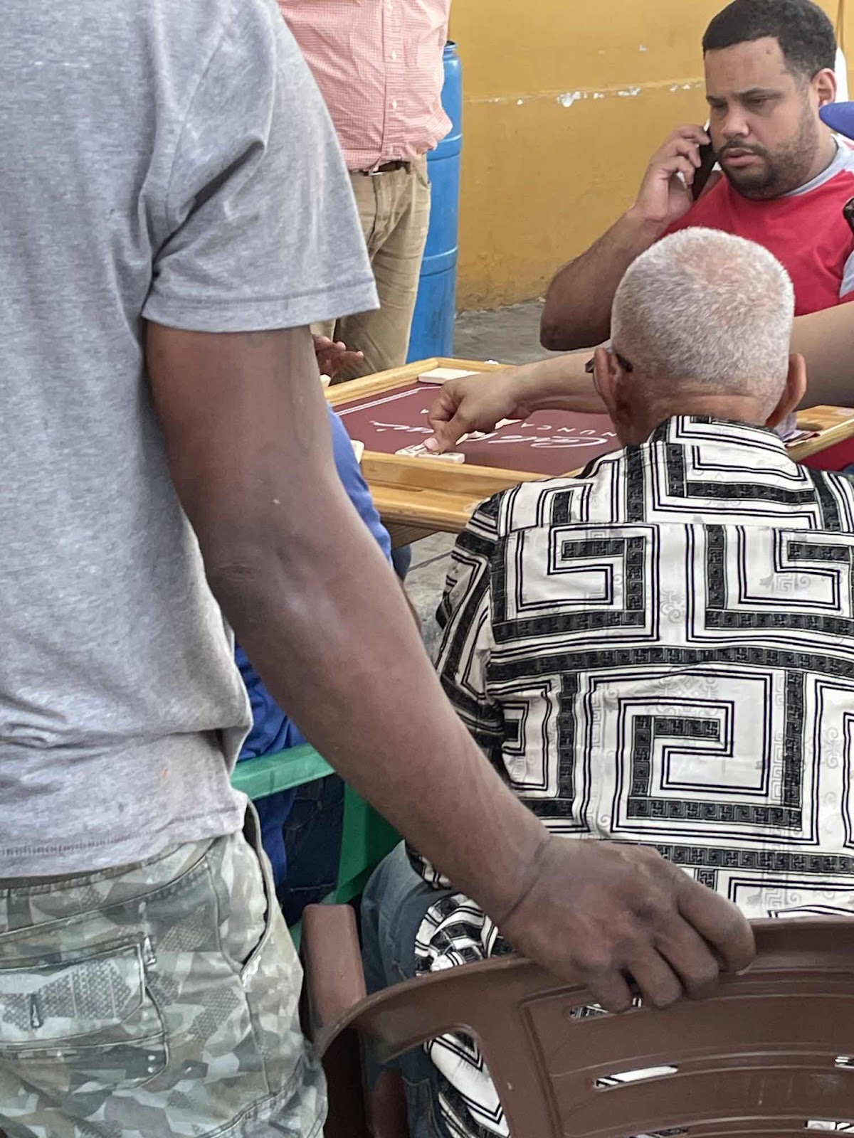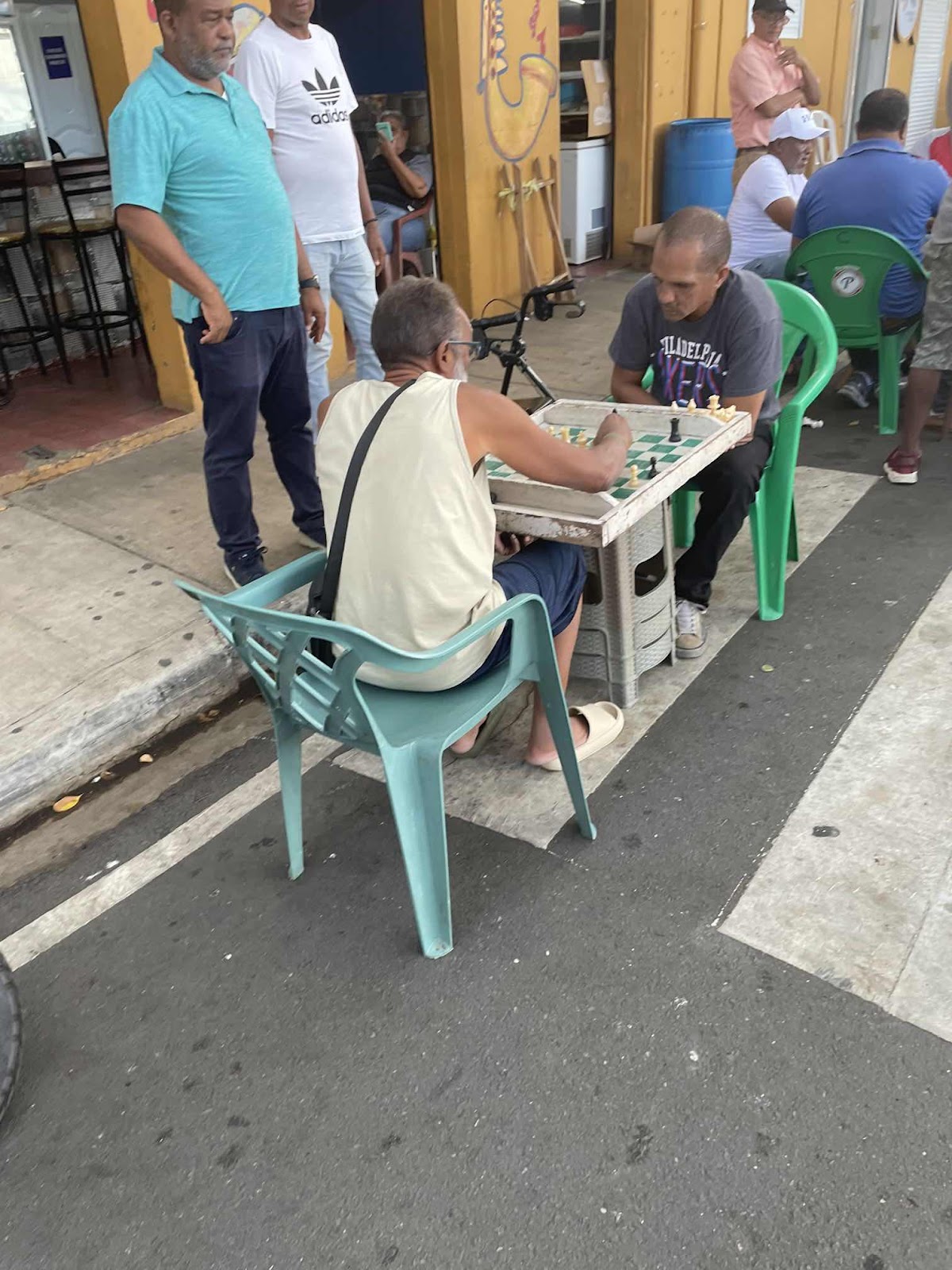 Auf dem Weg zurück in mein Viertel kam ich an einer Kneipe vorbei, wo die Männer draußen saßen und gespielt haben. Das habe ich gestern schon gesehen, dass hier relativ viel Schach gespielt wird, aber auch ein Spiel, das ein bisschen nach Dame aussieht, nur das Spielbrett ist sehr viel größer. Hier, wo ich gerade vorbeikomme, wird Domino um Geld gespielt und auch Schach (ohne Geld).
