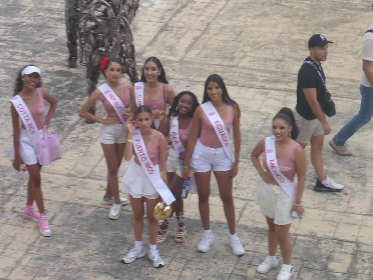 Von oben hat man auch einen schönen Blick einmal auf die Innenhöfe, aber auch auf die Außenwelt, und draußen kam gerade eine Gruppe von südamerikanischen Schönheitskönigin vorbei und ich könnte da noch ein Foto von schießen.