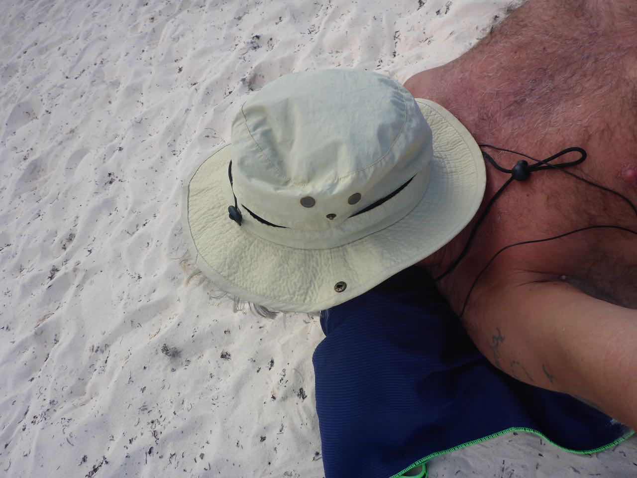 Das dreiteilige Programm von heute läuft gut. Ich bin ganz gemütlich zum Strand runtergelaufen, habe mir da ein Fleckchen gesucht und mich zusammen mit einem MP3-Player in den Sand gelegt. Vorsichtshalber habe ich mal den Sonnenhut ganz auf mein Gesicht gelegt, was zwar ganz wahrscheinlich bescheuert ausgesehen hat, aber es hat zumindest die Sonne etwas von meinem Gesicht ferngehalten.