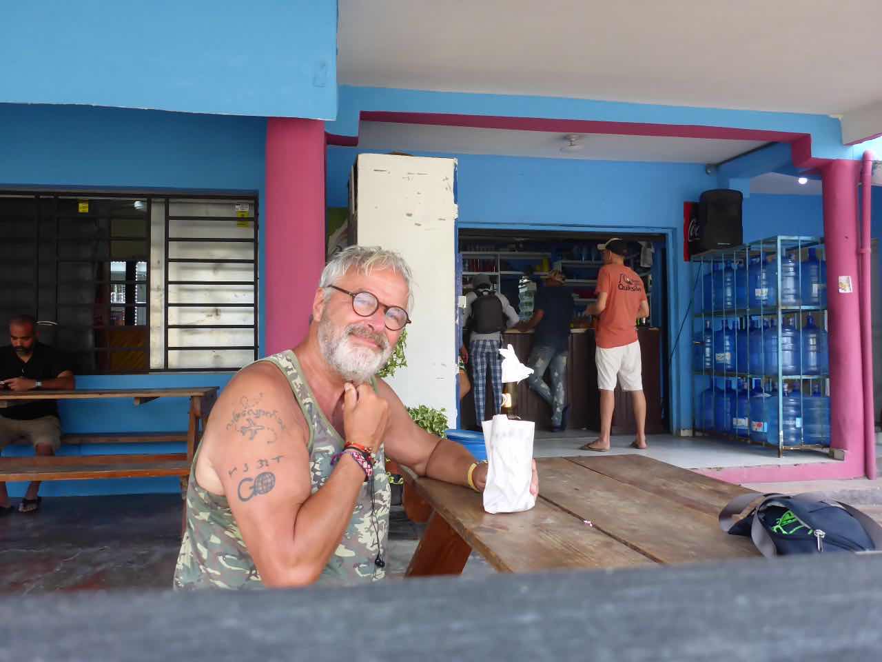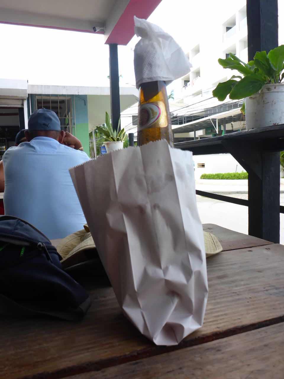 Nach meiner Pause unter der Klimaanlage bin ich dann noch mal am den Strand zurückgegangen. Jetzt waren ein paar Wolken da und es war deutlich angenehmer. Nun waren auch mehr Leute am Strand, ich denke in der Mittagszeit ist es einfach zu heiß. Nachdem ich mich jetzt hier vom ausruhen ausgeruht habe, bin ich dann langsam zurück zu meinem Hotel und kam vorher an einer illegalen Kneipe vorbei. Es war keine Kneipe, sondern eine Art Kiosk, aber davor waren Bänke und Tische und ich hab gestern schon gesehen, dass Leute hier ihr Bierchen trinken. Der Kollege hat natürlich keine Schanklizenz! Man erkennt das immer ganz gut daran, dass die Bierflaschen in Papiertüten versteckt werden. Das gleiche Konzept kenne ich aus Thailand, wo auch vor vielen Supermärktenbänke und Tische stehen war dann überwiegend deutsche Rentner sich ein billiges Bier reinschrauben.