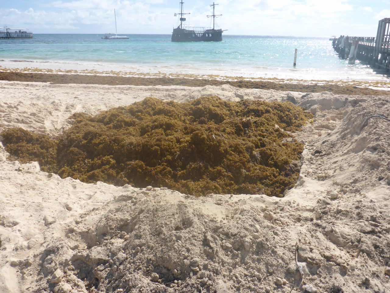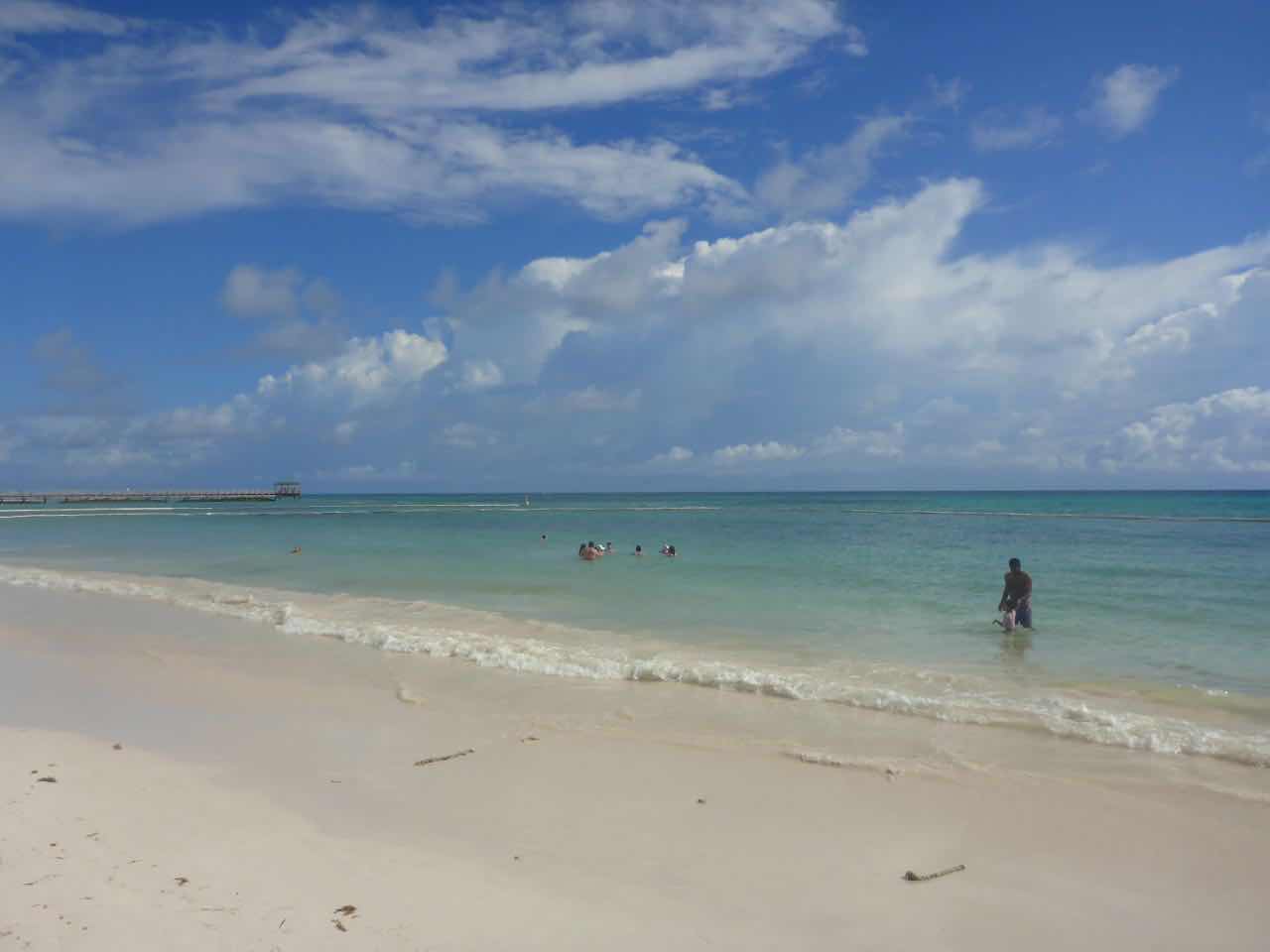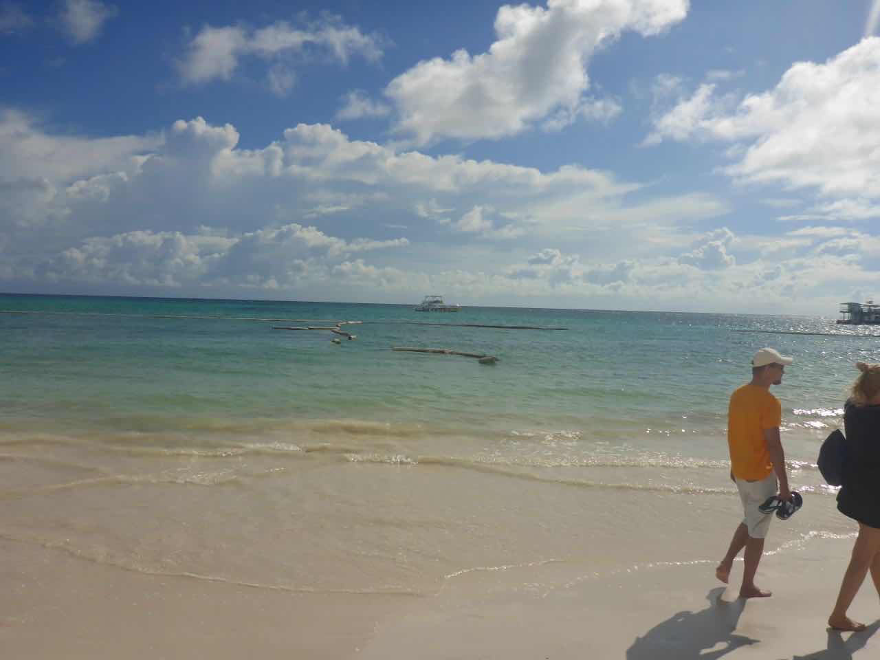 Ich ging dann in Richtung Strand. Der Strand ist circa 400 m von hier entfernt und ist natürlich komplett zugebaut mit Hotels und Ressorts. Es ist ein sehr schöner weißer Sandstrand und das Wasser sieht auch ganz gut aus. Wie ich später sehe, sieht es auch nur deshalb gut aus, weil draußen im Wasser Barrieren schwimmen, die den Tang abhalten. Es ist genau das, was ich auch auf anderen Karibikinseln gesehen habe: ein massives Tang Problem. Da, wo die Barrieren nicht sind, sammelt sich der Tang am Strand zu großen braunen, nicht so gut riechenden Haufen. Man behilft sich hier, indem man in den Sandstrand ein paar Löcher buddelt und die Pflanzenreste darin vergräbt. In der Hitze ist es keine schöne Arbeit.