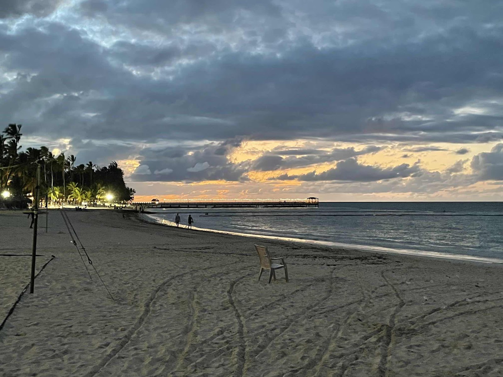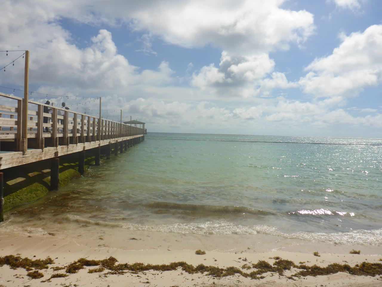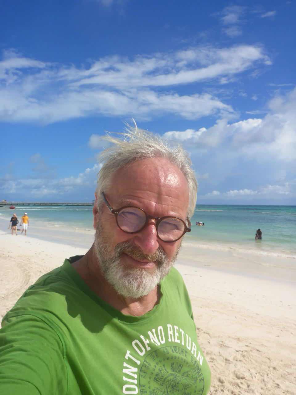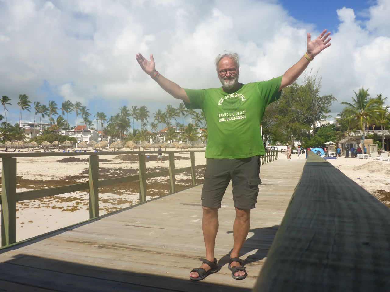 Ich ging dann in Richtung Strand. Der Strand ist circa 400 m von hier entfernt und ist natürlich komplett zugebaut mit Hotels und Ressorts. Es ist ein sehr schöner weißer Sandstrand und das Wasser sieht auch ganz gut aus. Wie ich später sehe, sieht es auch nur deshalb gut aus, weil draußen im Wasser Barrieren schwimmen, die den Tang abhalten. Es ist genau das, was ich auch auf anderen Karibikinseln gesehen habe: ein massives Tang Problem. Da, wo die Barrieren nicht sind, sammelt sich der Tang am Strand zu großen braunen, nicht so gut riechenden Haufen. Man behilft sich hier, indem man in den Sandstrand ein paar Löcher buddelt und die Pflanzenreste darin vergräbt. In der Hitze ist es keine schöne Arbeit.