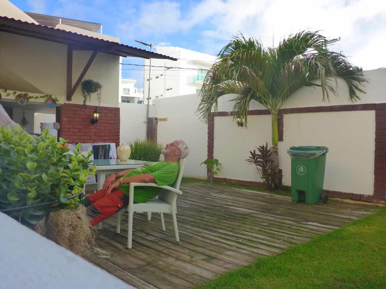 Aber hier war eine Schelle. Die bemühte ich einige Male, aber nichts passierte. Um das klarzustellen: der Checkin hier ist ab 13:00 Uhr, ich hatte mit dem Hotelier hin und her gemailt und gefragt, ob er mich vielleicht für den halben Preis auch schon um 6:00 Uhr einlässt. Das wollte er nicht. Er sagte wenn, dann müsste ich eine volle Nacht bezahlen. Daraufhin habe ich notgedrungen gesagt okay bevor ich hier um 6:00 Uhr morgens irgendwo rumsitze, mache ich halt das. Das Zimmer kostet 48€ pro Nacht, das ist ja nicht nichts. Aber irgendwie ist da irgendwas irgendworum schief gegangen. Ich komme hier nicht weg, weil die Haupttür nach draußen abgeschlossen ist und weil ich auch keine Lust habe mit ihm Rucksack irgendwie an den Strand zu gehen. Außerdem hab ich immer nochdie relativ warmen Sachen aus Ecuador an, was meine Laune auch nicht besser macht.